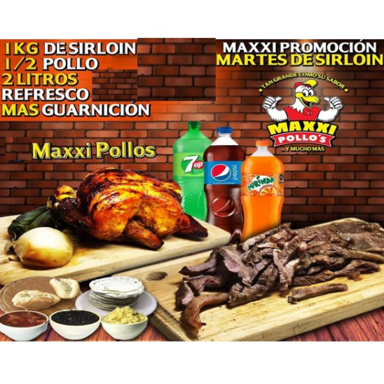 1 kg De sirloin, 1/2 pollo, 1 refresco 2 L y guarniciones (orden de arroz o frijol, salsa, tortillas, papa horneada, cebolla, jalapeño toreado y bolillo con aderezo de ajo).