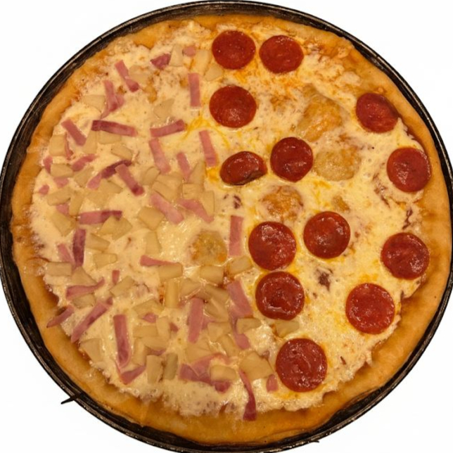 Pizza mitad pepperoni y hawaiana