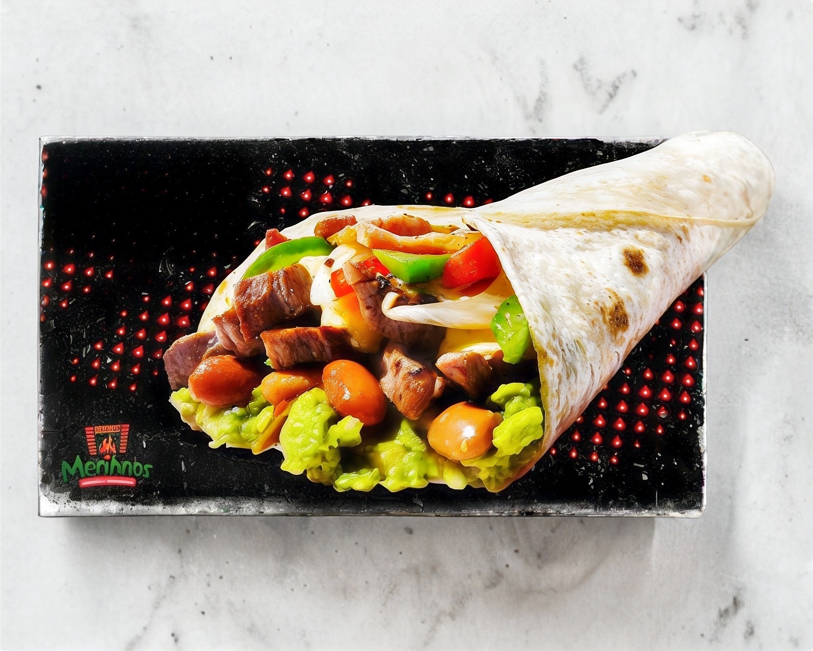 TORTILLA DE 30 CM, QUESO GOUDA, GUACAMOLE, FRIJOL, PIMIENTO, CEBOLLA, TOCINO