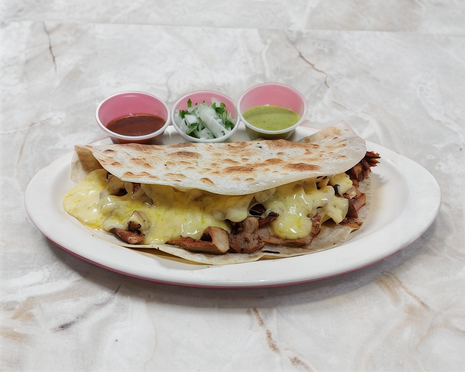 TORTILLA DE 30 CM, QUESO GOUDA, CEBOLLA Y CILANTRO, SALSAS