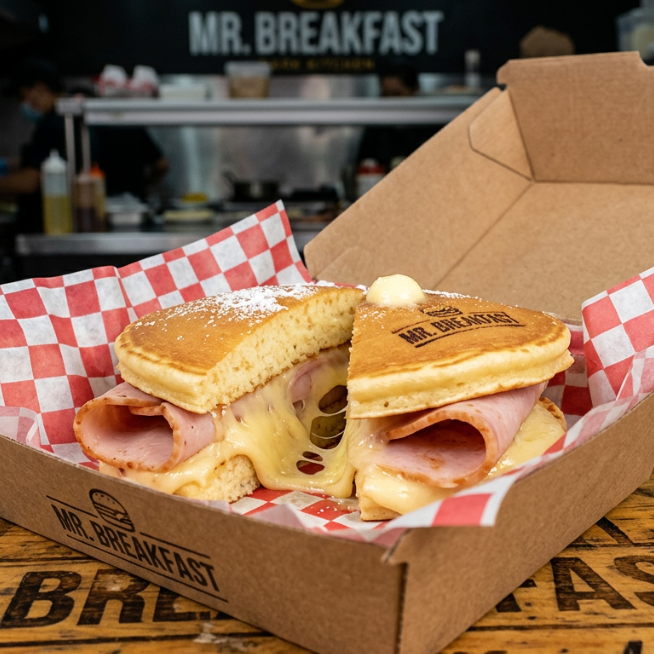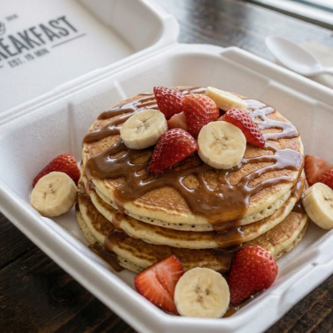 El clásico que nunca falla, servido con el estilo de Mr. Breakfast! Tres hot cakes grandes y súper esponjosos, Personaliza a tu gusto