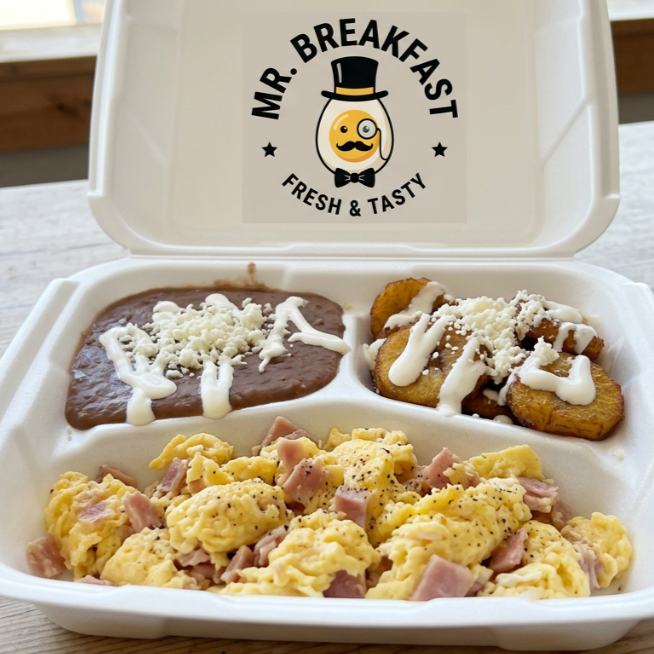 ¿Hambre de algo real? Te preparamos un desayuno completo y con todo el sabor casero: 2 huevos con jamón bien servidos, una porción generosa de frijolitos refritos con queso y el toque dulce de plátanos machos fritos con su crema y quesito. Es el abrazo que tu estómago necesita hoy. ¡Pídelo y compruébalo!