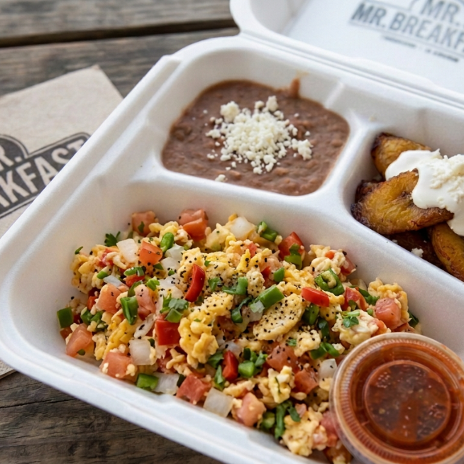 ¡El sabor de casa en su versión más amigable! Disfruta de una porción generosa de huevos revueltos con un sofrito fresco de tomate y cebolla. Acompañados de nuestros tradicionales frijoles refritos con queso y el toque dulce de plátanos maduros fritos con crema y quesito.