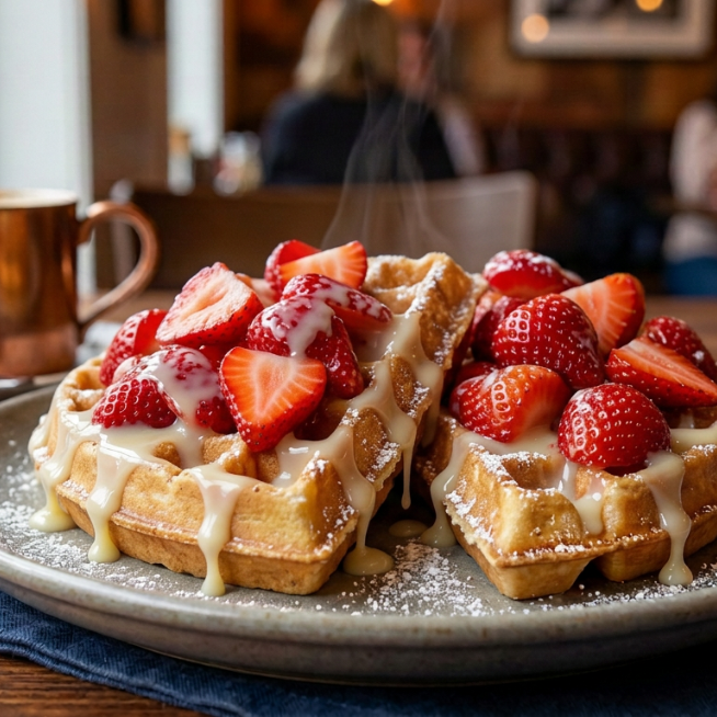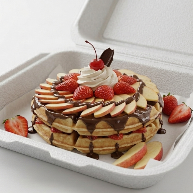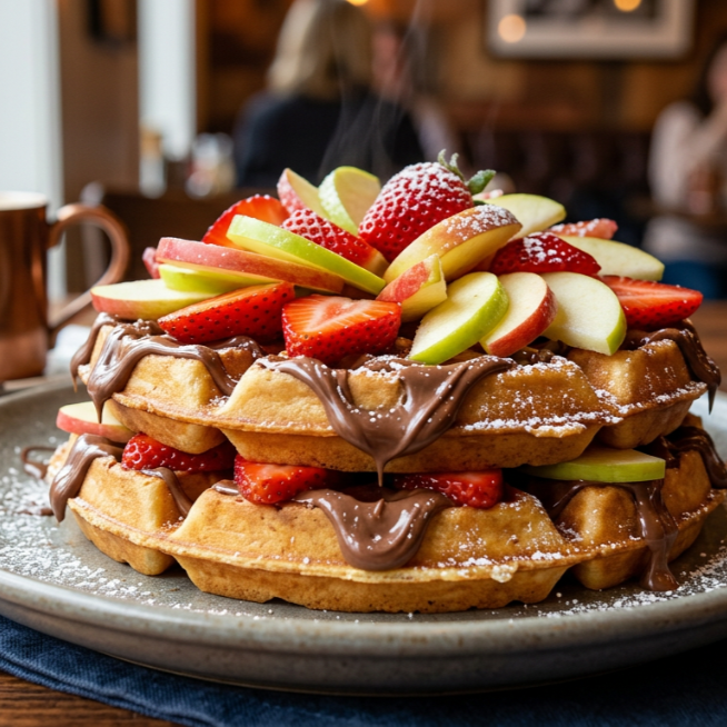 ¡El postre perfecto para consentirte! Disfruta de dos waffles redondos, dorados y crujientes, rellenos de frescas láminas de manzana en media luna y jugosas fresas. Bañado generosamente con nuestro jarabe de chocolate, coronado con una suave nube de crema chantilly y el toque final de una cereza.