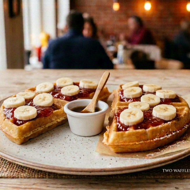 Doble ración de felicidad: 2 waffles belgas con mermelada de fresa y rodajas de plátano fresco. Calientes, dulces y deliciosos. Servidos en empaque térmico para garantizar la mejor textura hasta tu hogar.