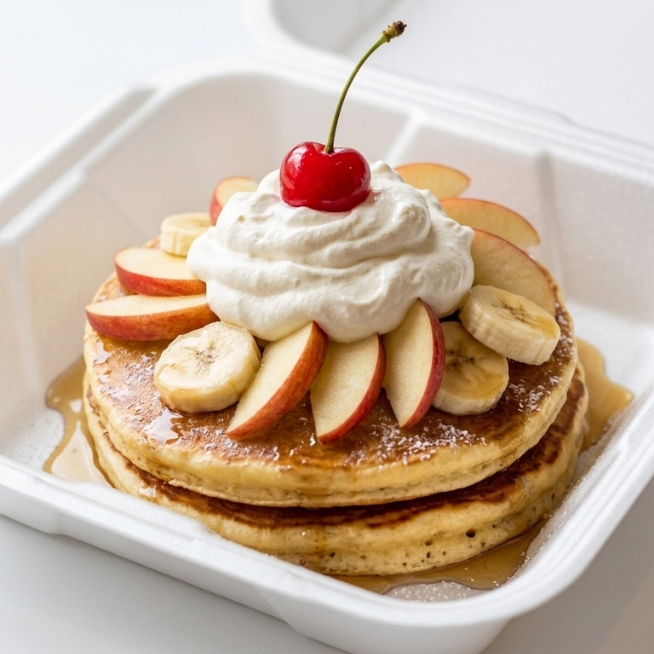 Dos esponjosos hot cakes recién hechos, decorados con láminas de manzana roja en media luna y rodajas de plátano maduro. Coronados con una generosa nube de crema batida tipo chantilly, una cereza dulce al tope y un toque de miel. ¡El desayuno perfecto para consentirte!