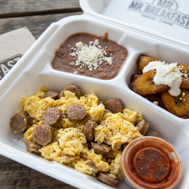 ¡Abundante, caliente y directo al grano! Una porción generosa de huevos revueltos con salchicha de pavo premium compañados de nuestros tradicionales frijoles refritos con queso y el toque dulce de plátanos maduros fritos con crema y quesito.