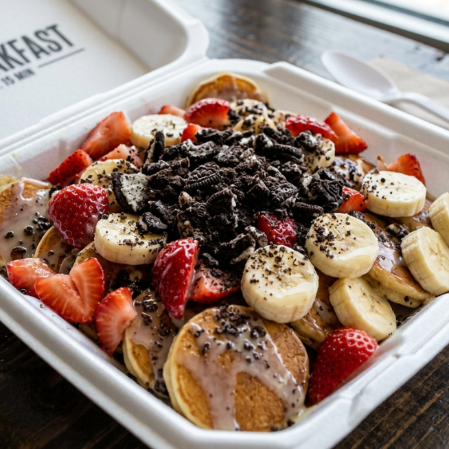 ¡La tentación hecha desayuno! 15 mini hotcakes esponjosos bañados con tu jarabe favorito y coronados con tu topping preferido ¡Pídelos calientitos!