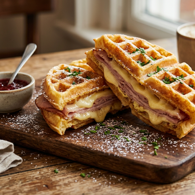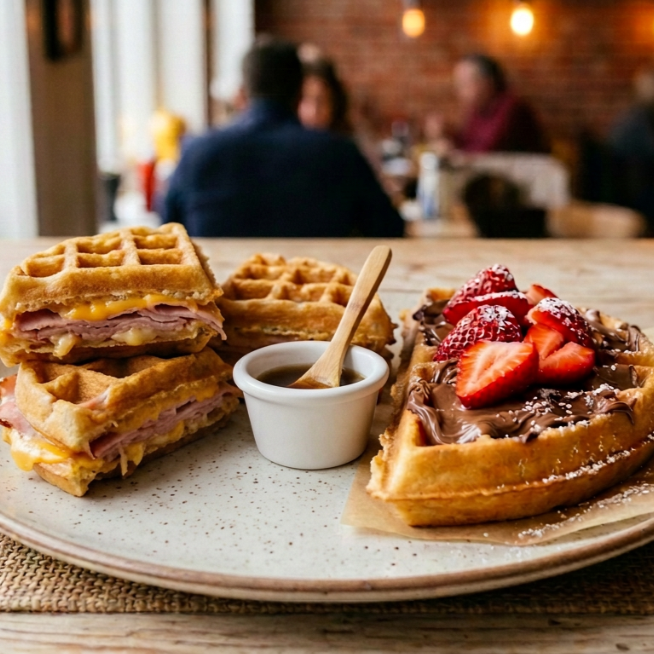 El favorito de la casa: Waffle belga relleno de jamón y queso manchego derretido.dip de miel. La combinación más famosa del mundo, lista para disfrutar en la comodidad de tu hogar.
