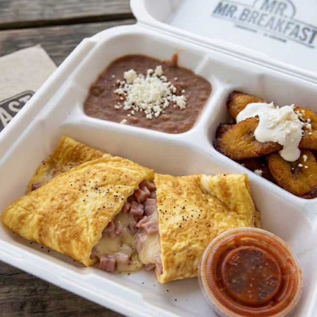 ¡Elegancia y sabor en cada bocado! Omelet de tres huevos preparado al momento, con un corazón generoso de jamón de pavo seleccionado y queso manchego fundido. Acompañado de nuestros tradicionales frijoles refritos con queso y el toque dulce de plátanos maduros fritos con crema y quesito.