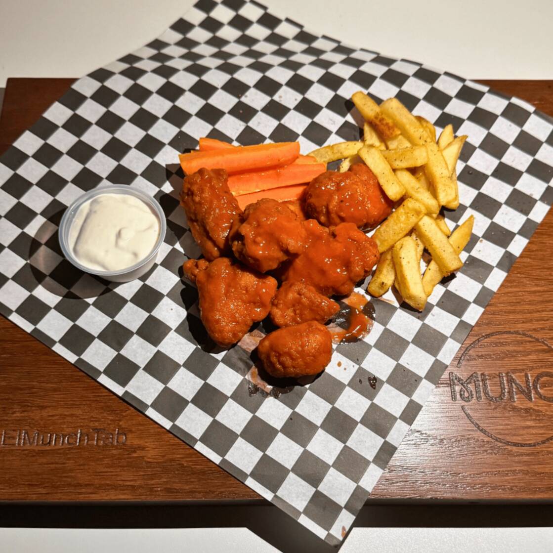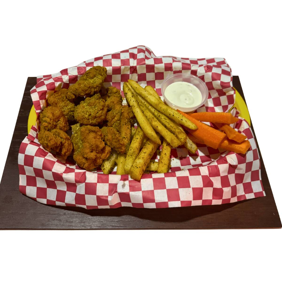 200 gr de boneless bañados en Lemon Pepper acompañados de 100 gr de papas a la francesa y 50 gr de zanahoria