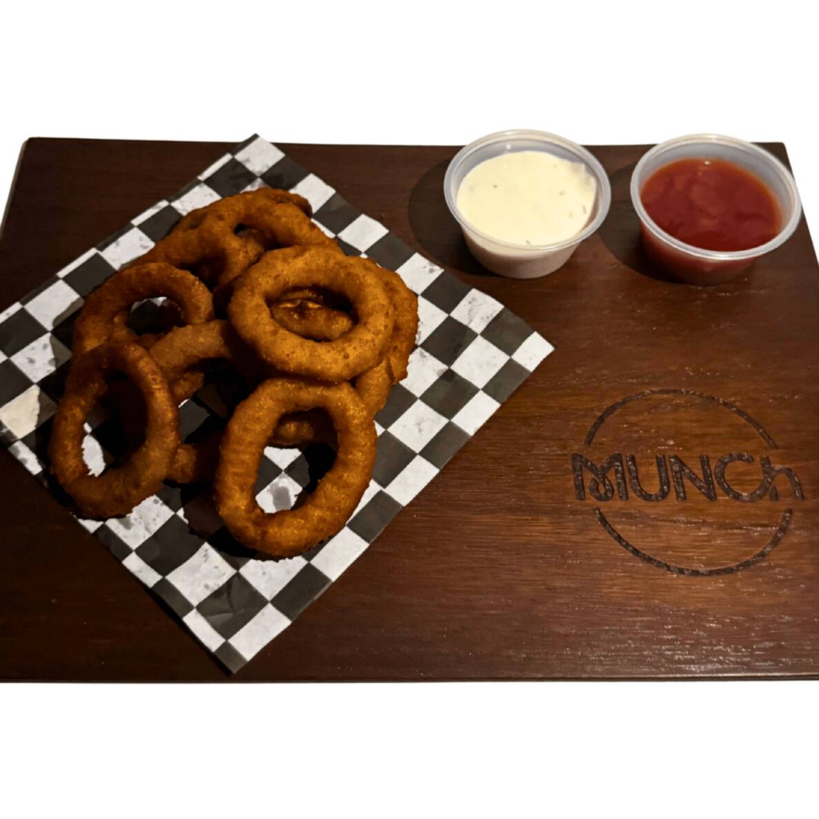 12 piezas de aros de cebolla acompañados con salsa de la prego, ranch y vegetales