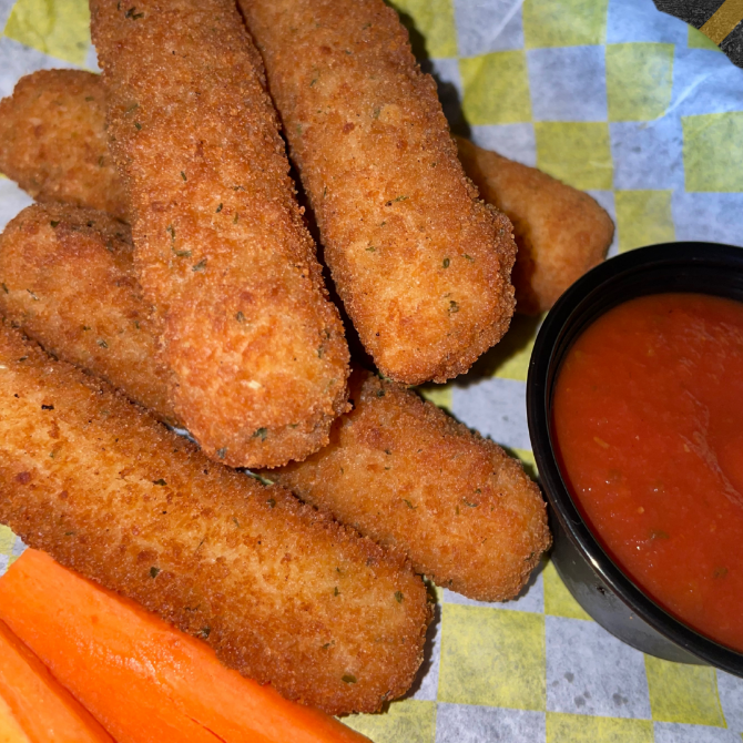 6 piezas de dedos de queso, acompañados de salsa de la prego, ranch y vegetales
