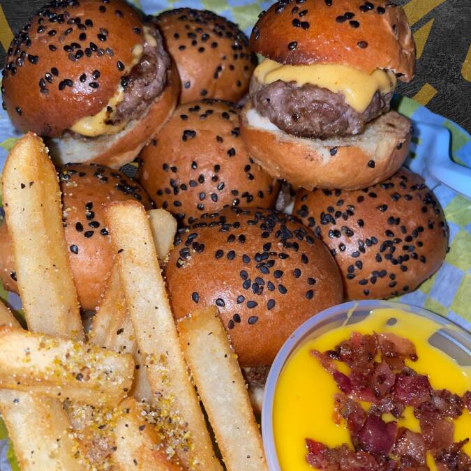 8 Sliders de carne de res a la plancha acompañadas de queso derretido con tocino