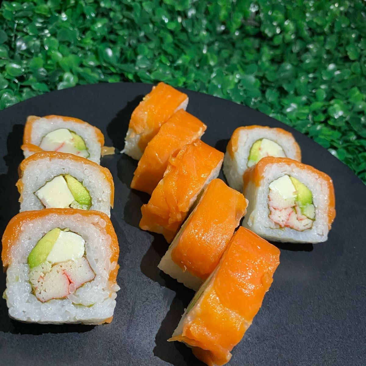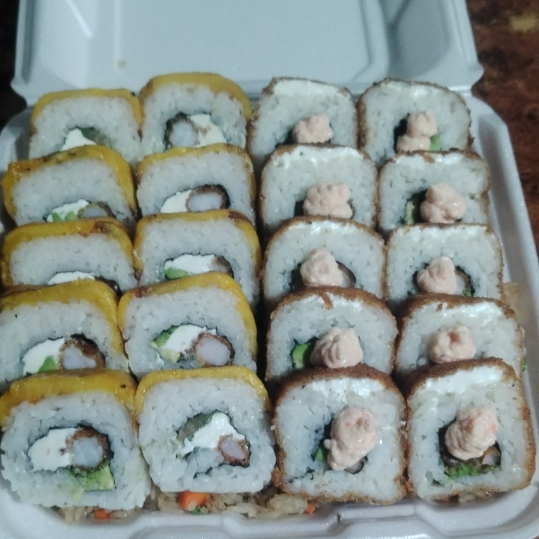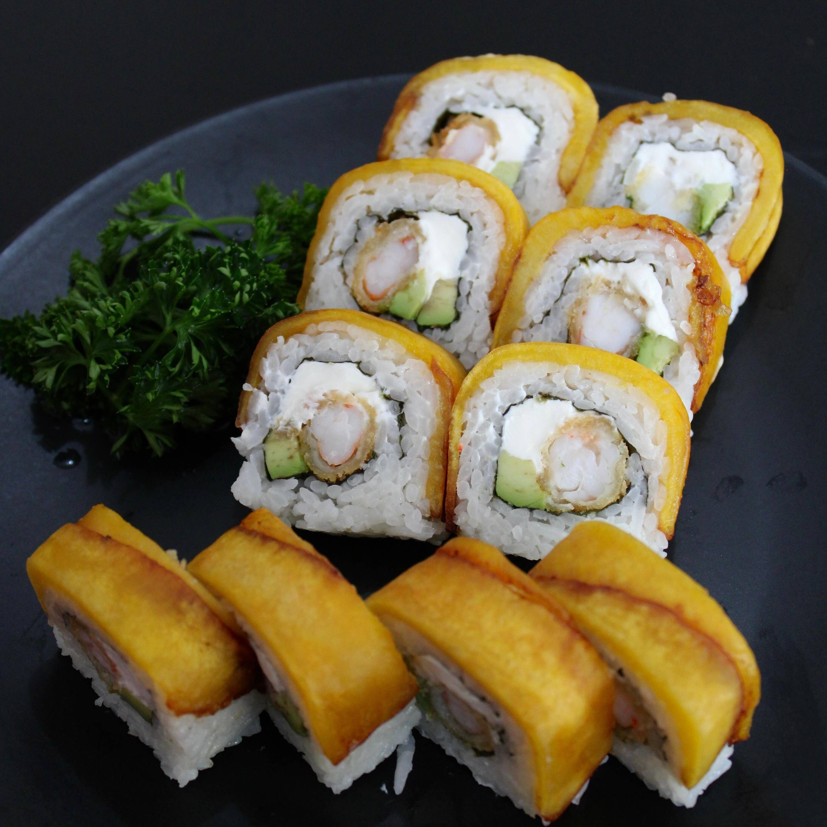 Por dentro salmón, queso y camarón empanizado, por fuera aguacate, cangrejo y Tampico