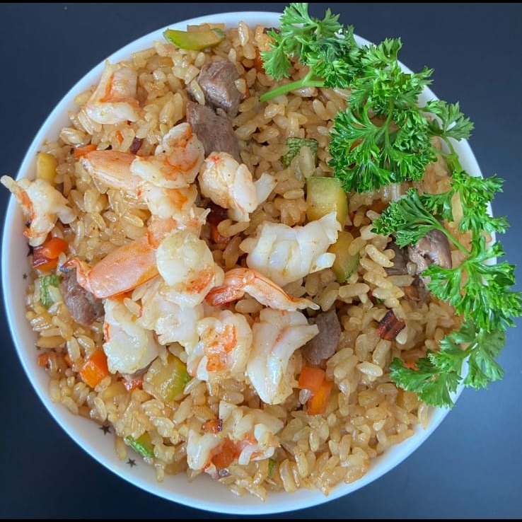 1 rollo monki roll, 1 pinta maki, 1 rufles roll, kushajes de queso crema y arroz yakimeshi de verduras