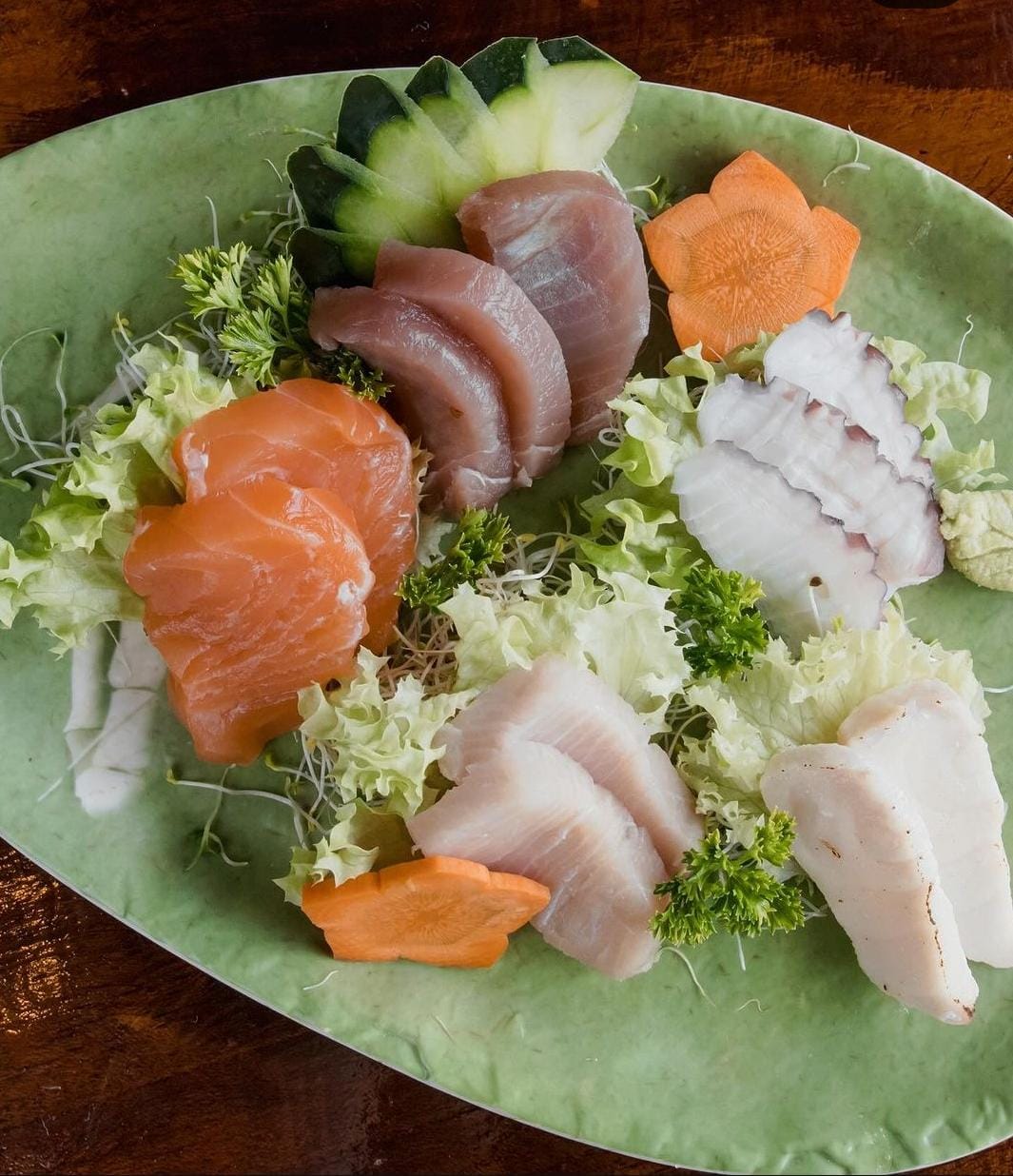 Rollo envuelto en hoja de pepino y alga, por dentro atún, salmón, kani y aguacate, coronada con spicy mayo y tobiko.