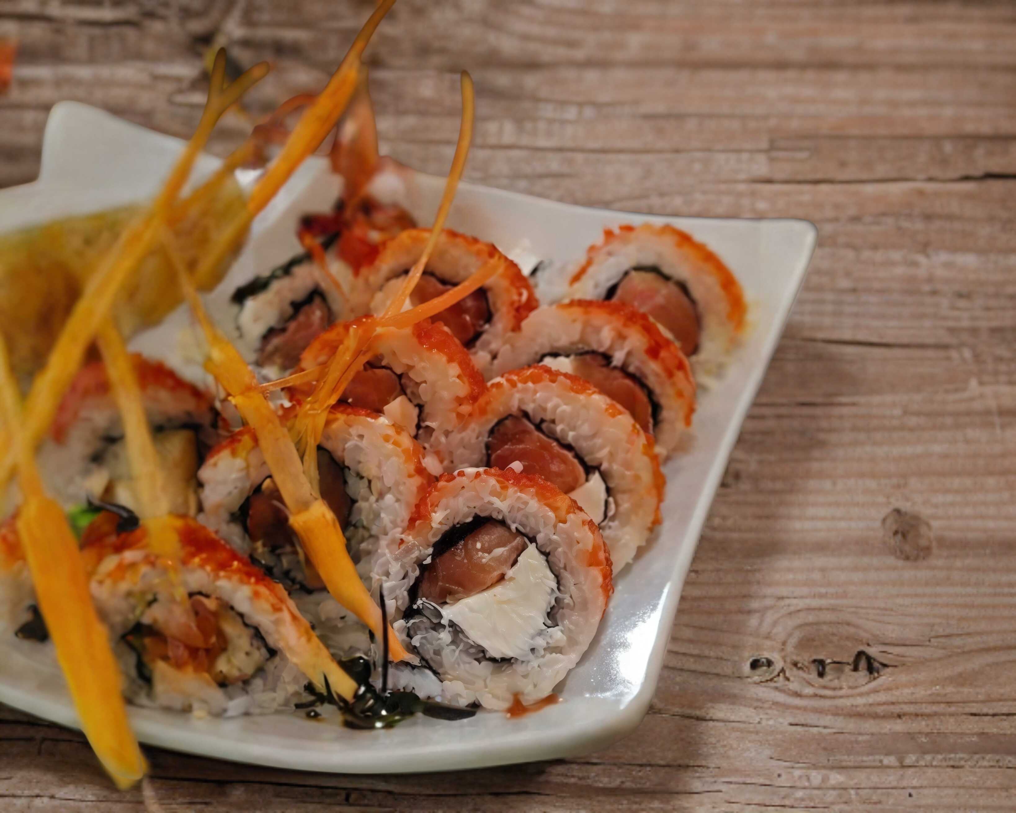 tampico, aguacate, surimi y zanahoria capeada, con salsa dulce
