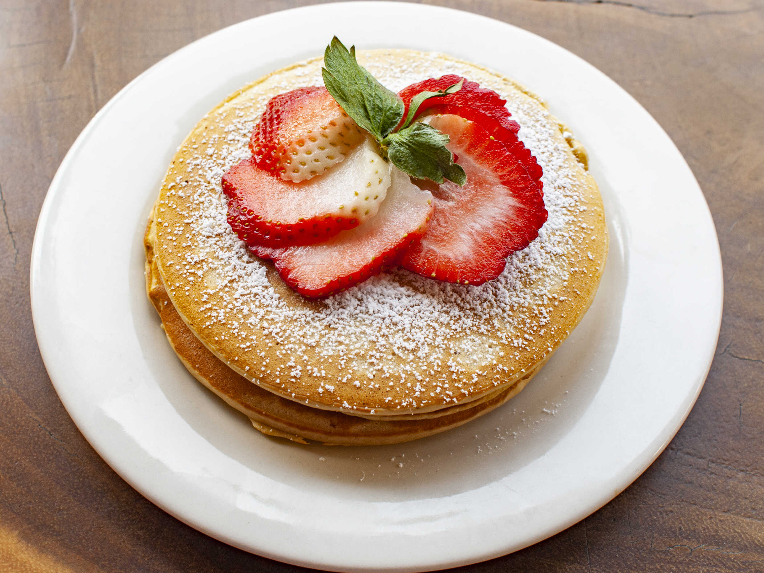 Pan de caja bañado en un mezcla de la casa al sartén con mantequilla, decorado con arándanos, kiwi, fresa y plátano.