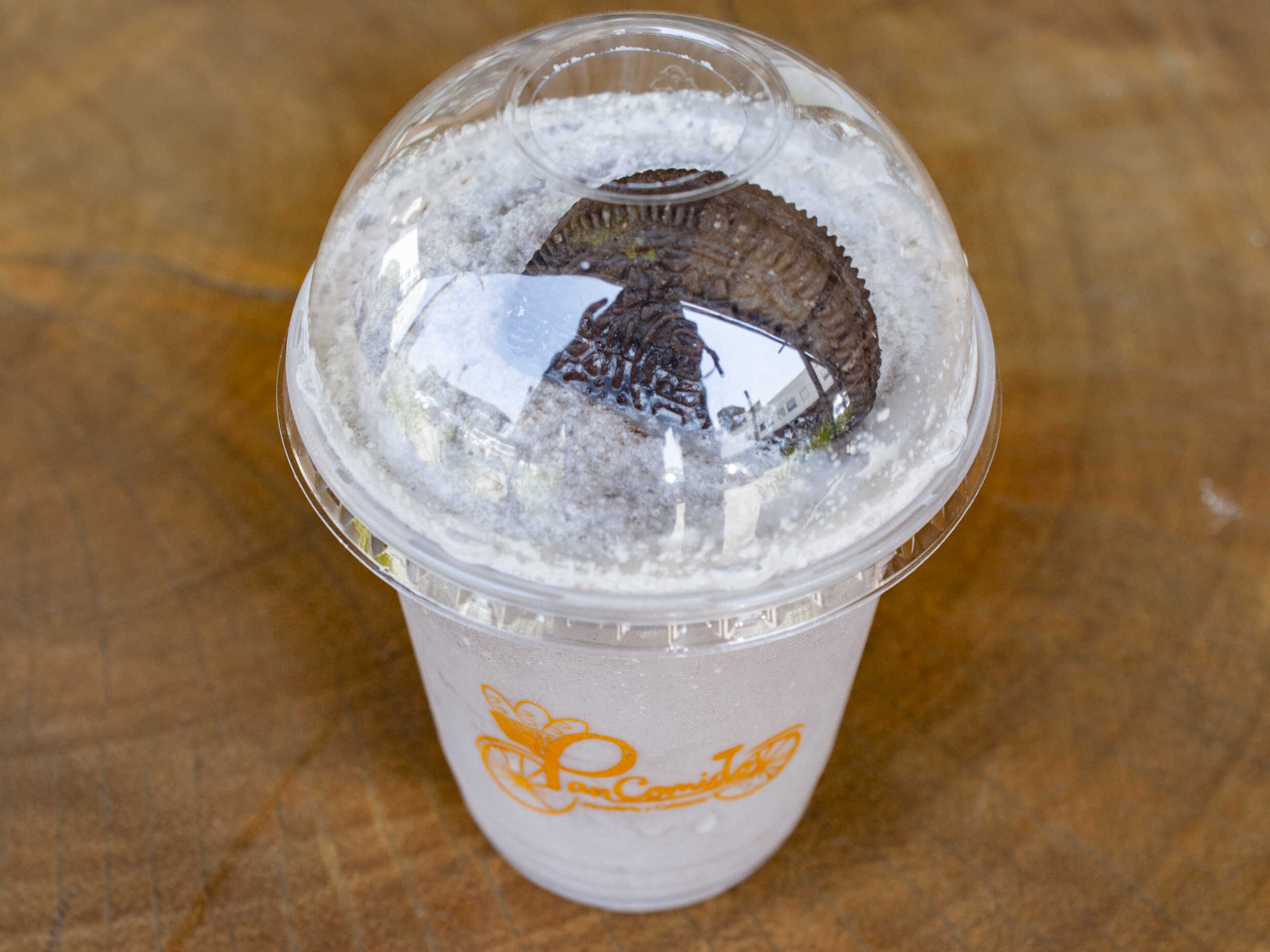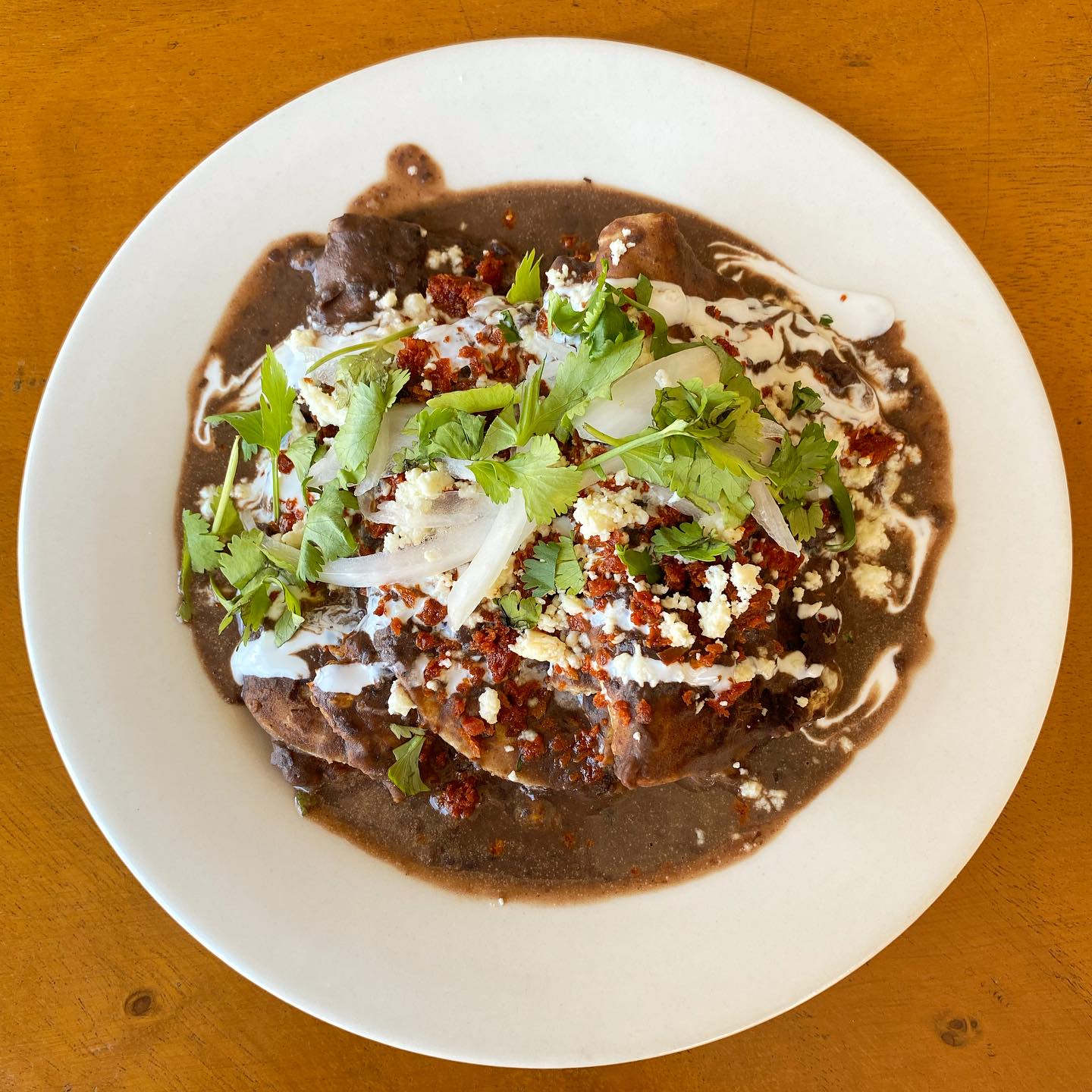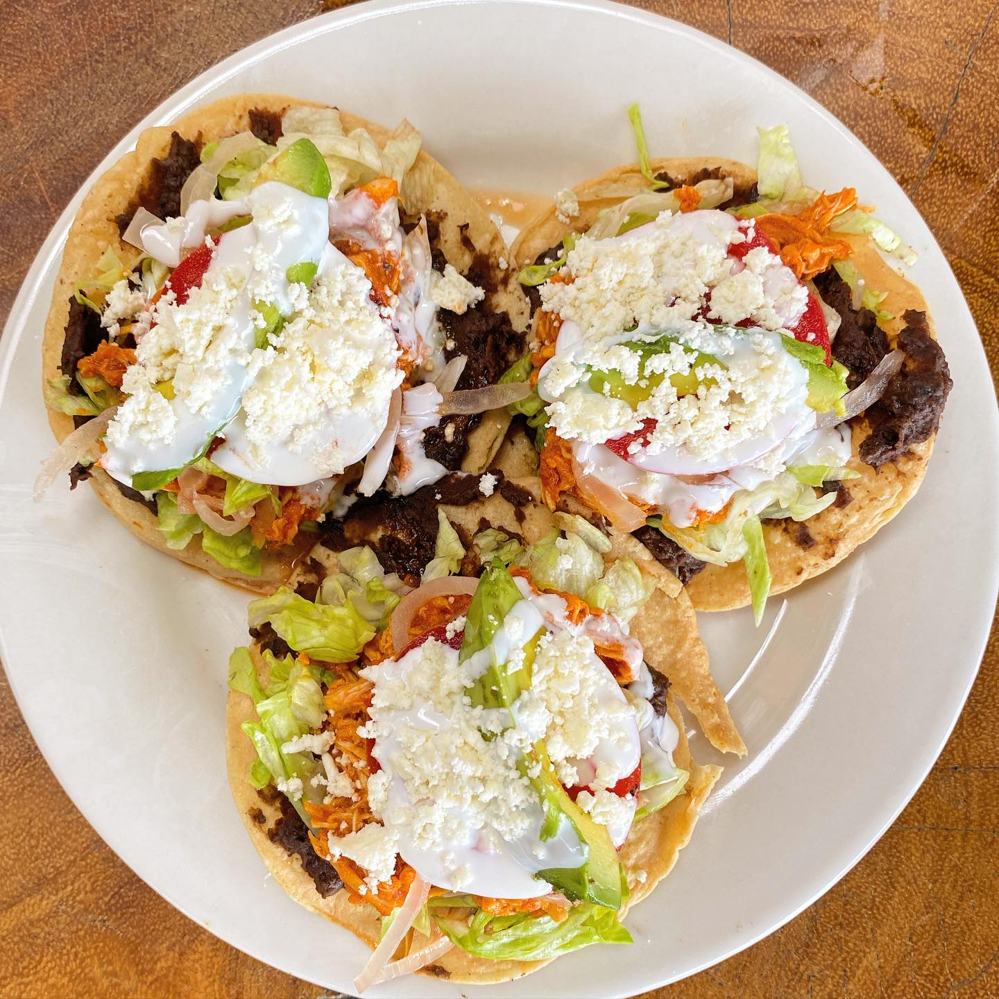 4pzas bañadas frijolitos con queso doble crema, media crema, chorizo, cilantro y cebolla.