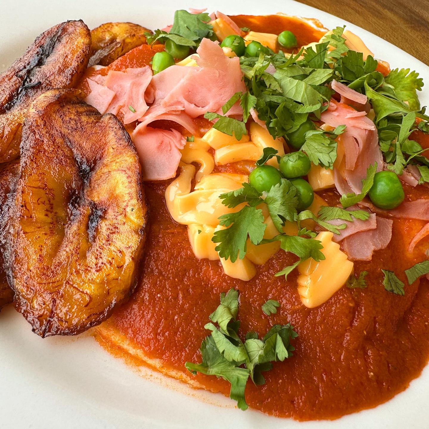 Tortilla sofrita , bañados en salsa roja con chícharo, queso amarillo, jamón , un toque de cilantro. Frijolitos y platanito.