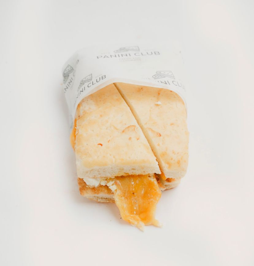 Combinación de quesos gratinados, queso manchego, queso cheddar, y queso de cabra con mayonesa de tomate deshidratado con jamón de pavo y aguacate.
