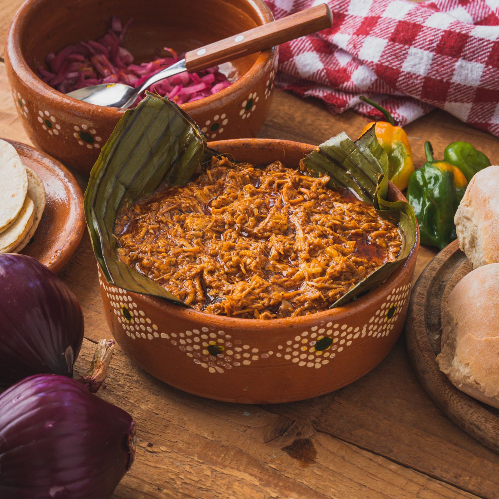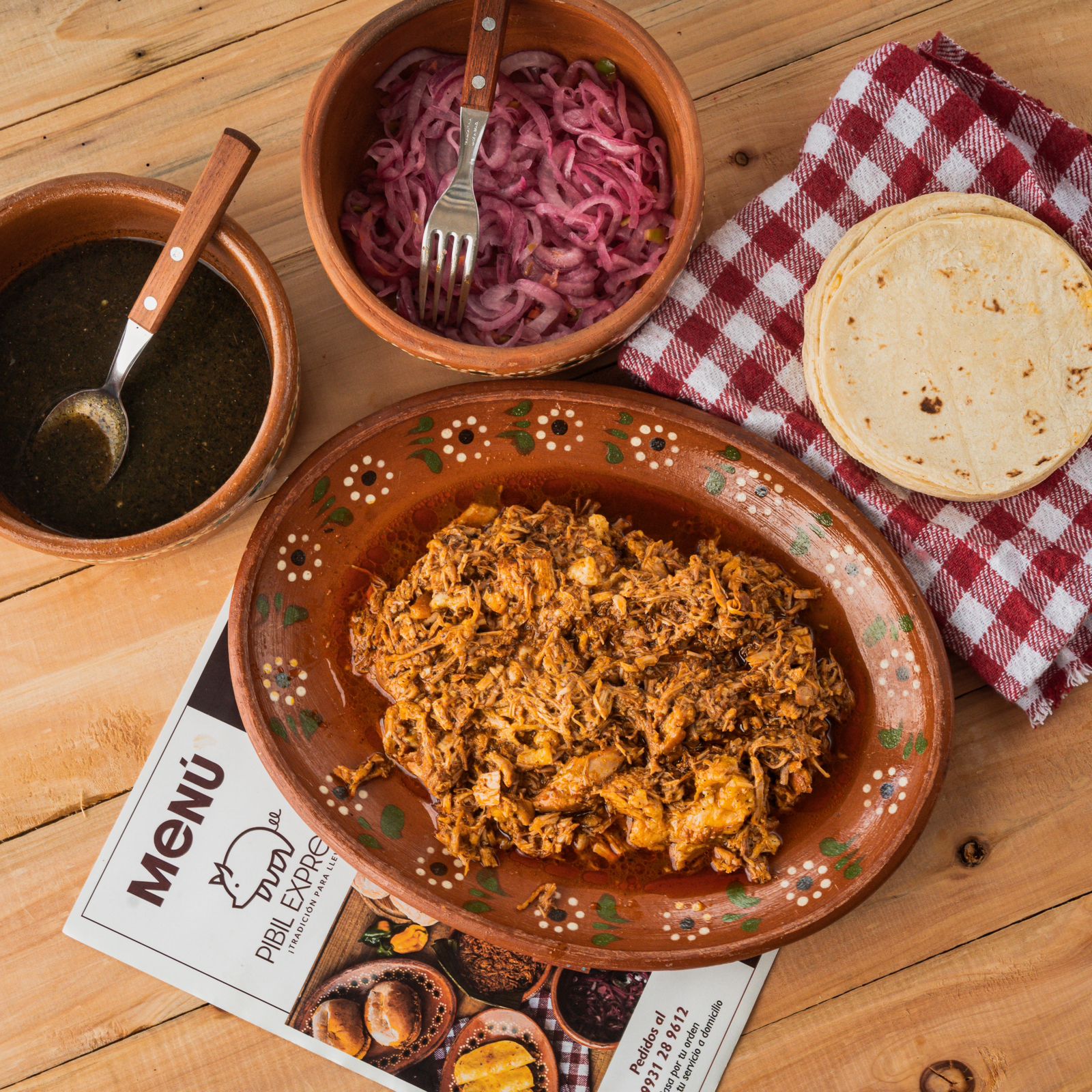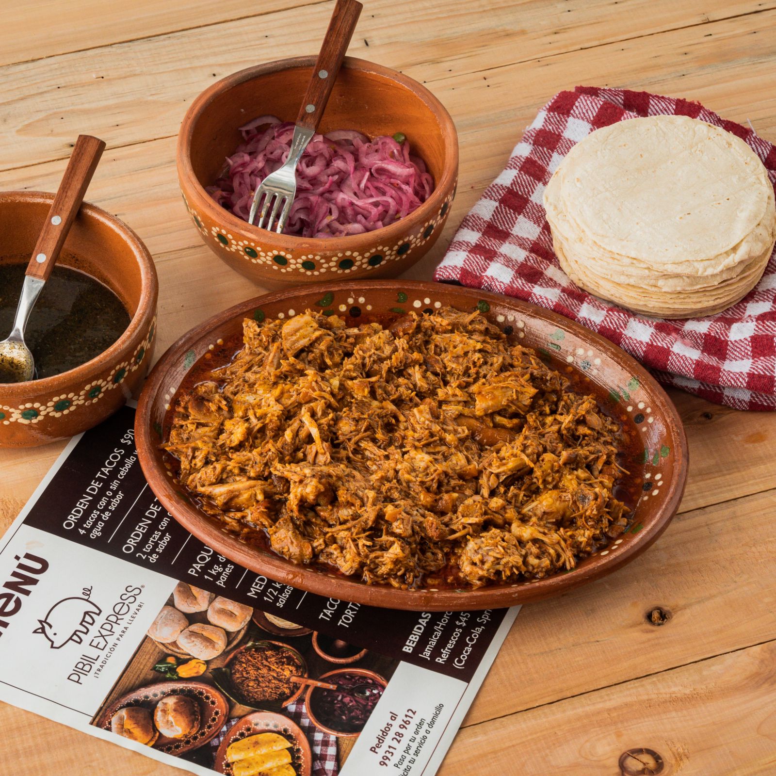 Medio kilo de cochinita, medio kilo de tortilla, salsa habanera y cebolla morada curtida.