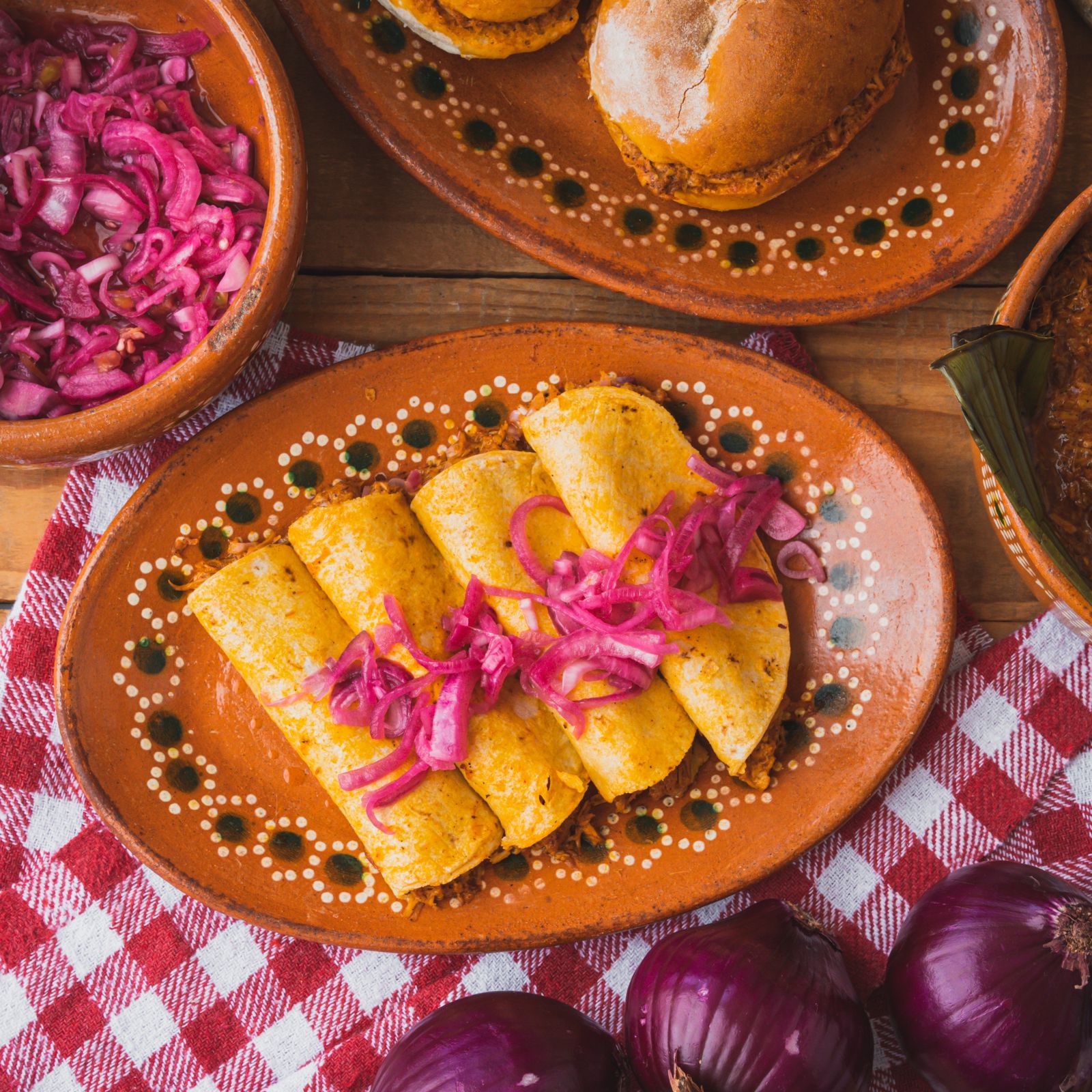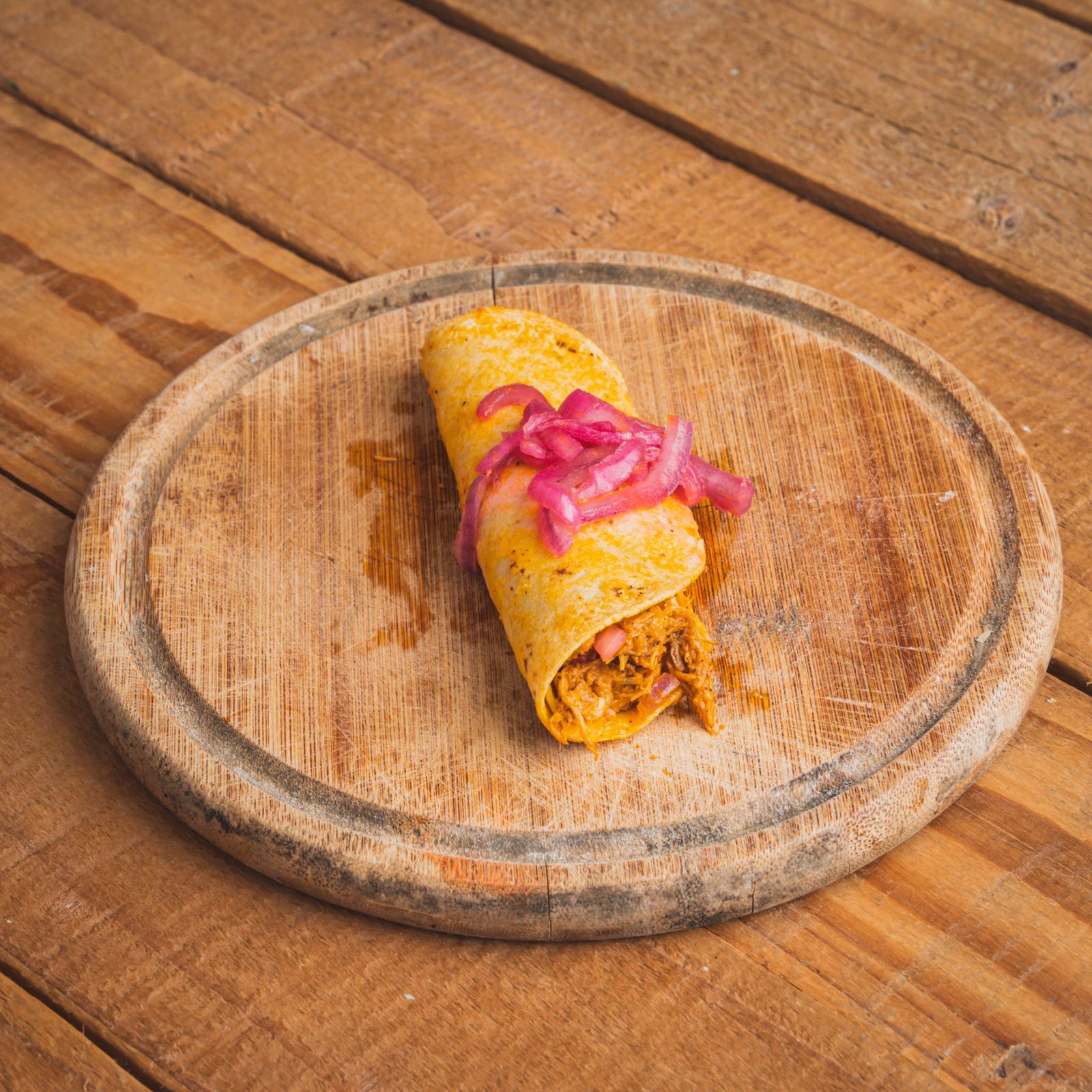 Tortilla de maíz rellena de cochinita pibil, salsa habanera y cebolla curtida.