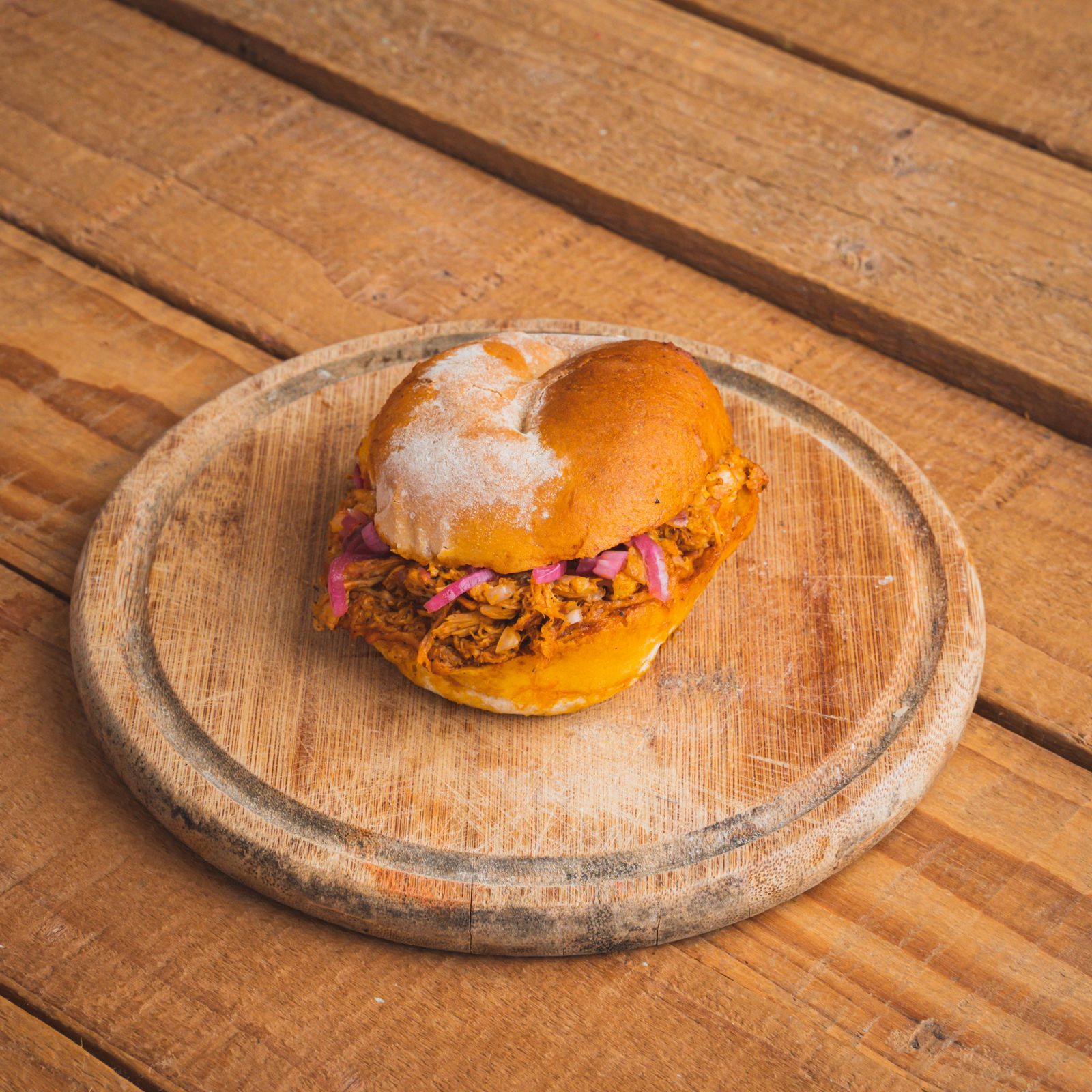 Torta de cochinita pibil servida en un bolillo fresco y suave, acompañada de salsa habanera con cebolla curtida.
