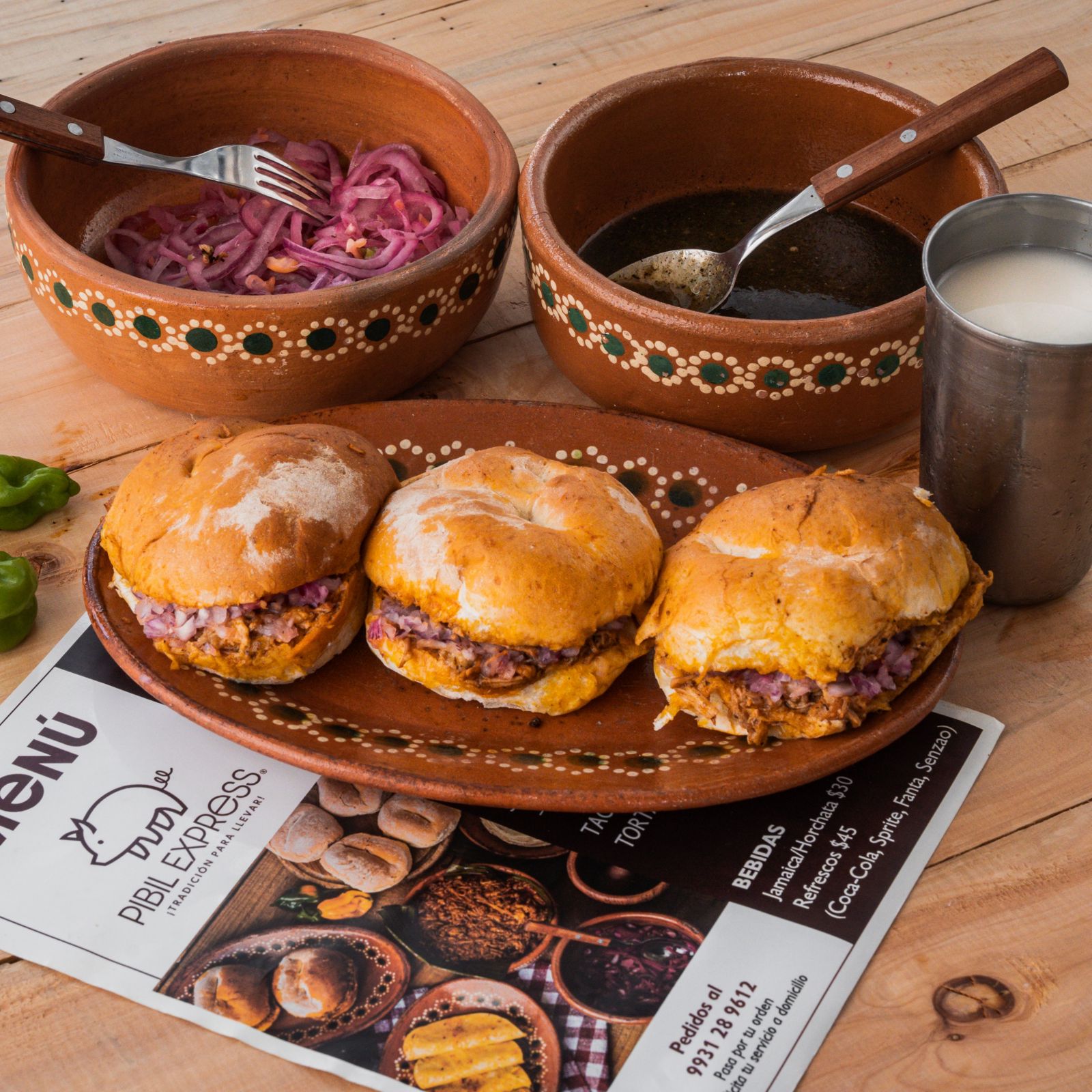 3 Tortas de cochinitas, pan bolillo redondo, carne de cochinita de pibill y 1 agua de sabor 600ml. Incluye salsa habanera y cebolla morada curtida.