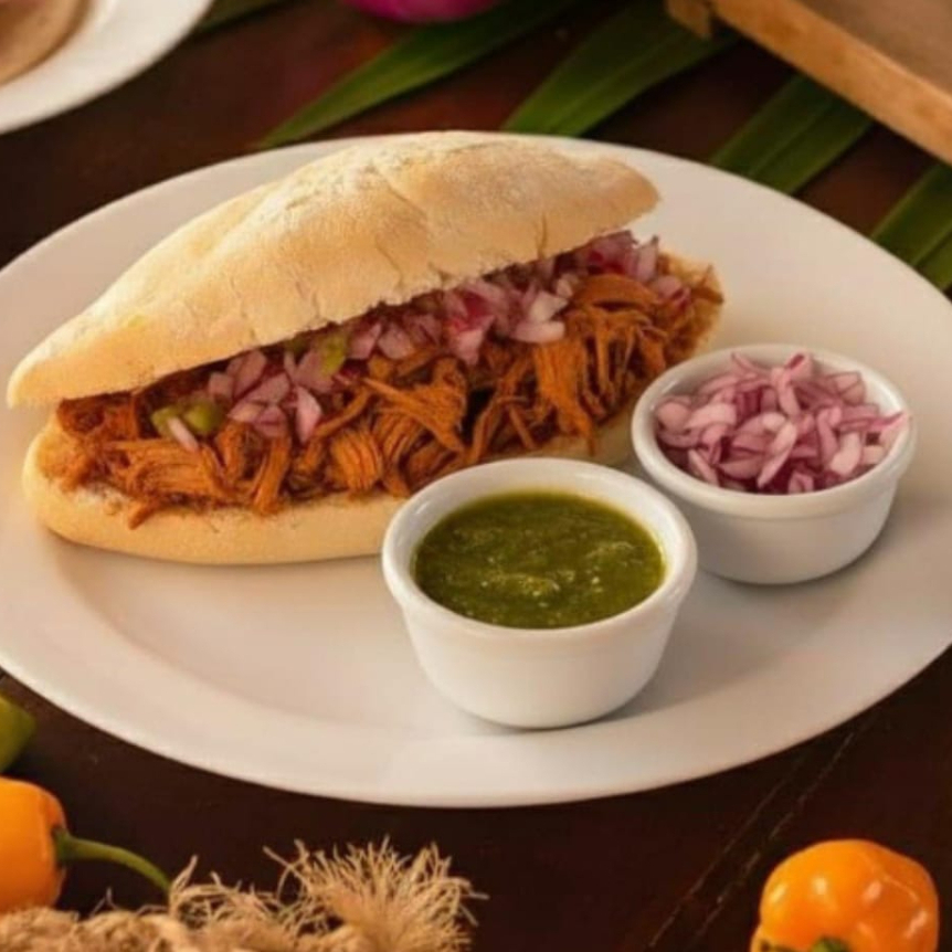 Deliciosa torta rellena de cochinta pibil doradita con un toque de mayonesa, acompañada de cebollita morada curtida y salsa habanera