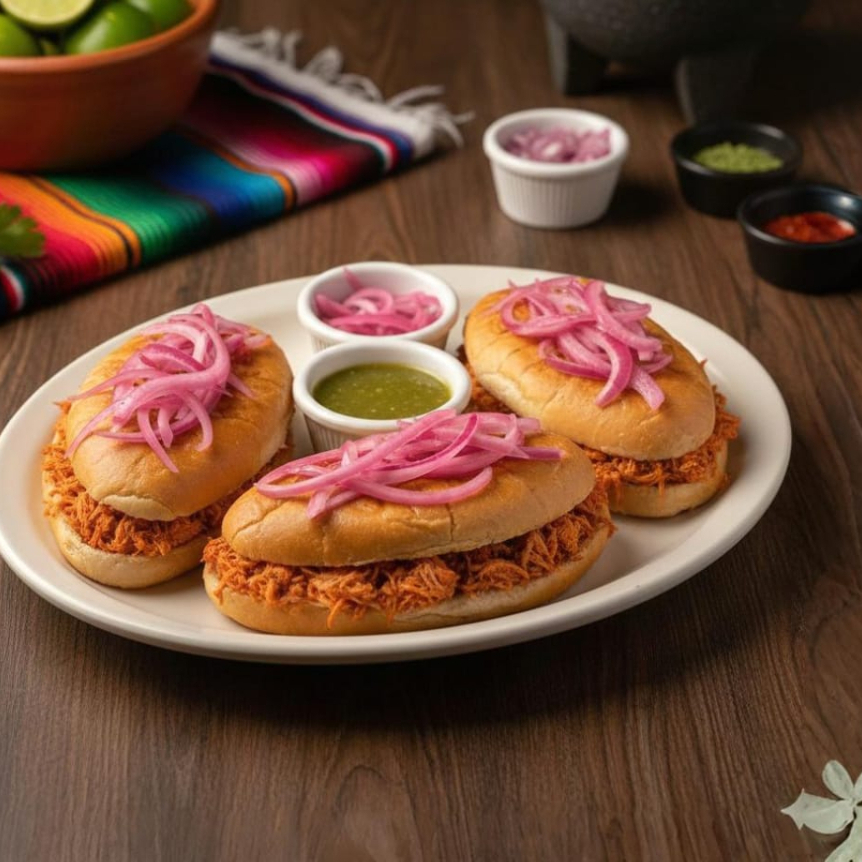 Tres tortas rellenas de deliciosa cochinita pibil, bolillos doraditos con un toque de mayonesa acompañados de cebollita morada curtida y salsa verde habanera