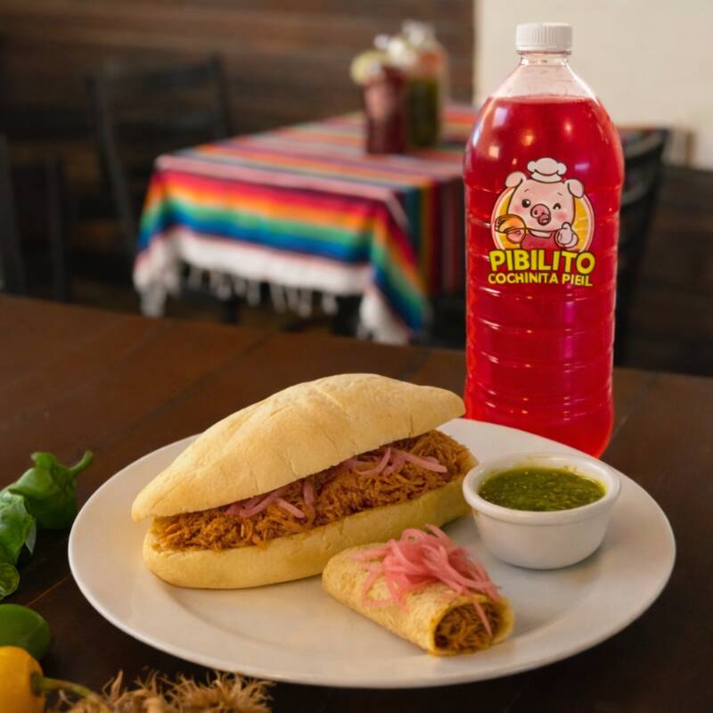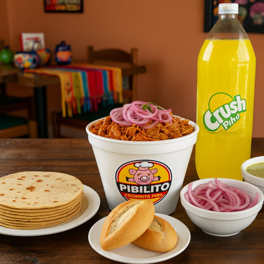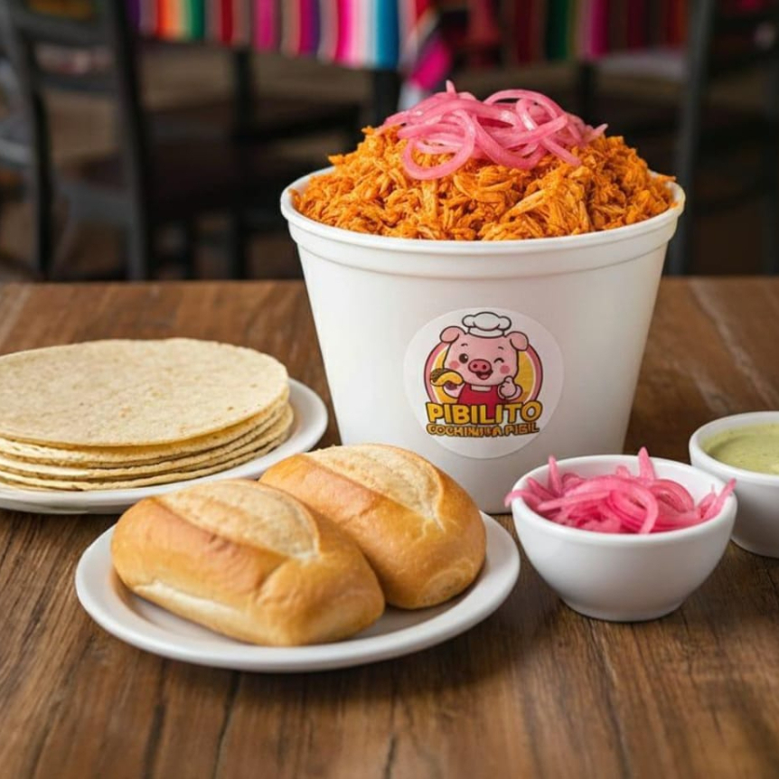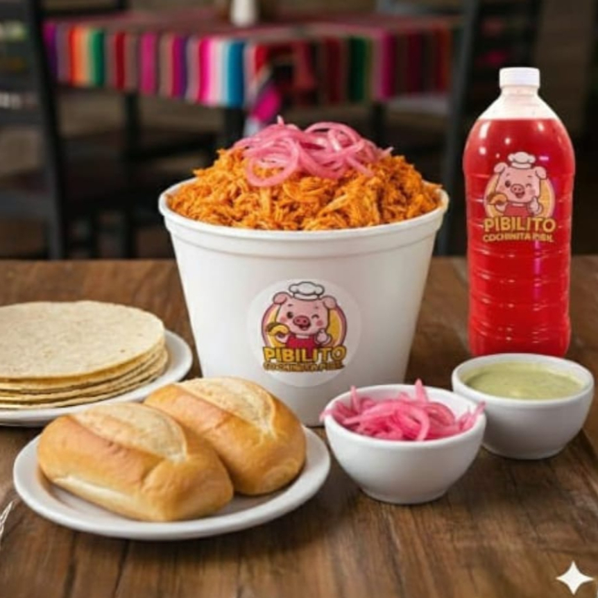 1 kg de cochinita pibil incluye: Refresco de 2lts de sabor, 500gr de tortillas, cebollita morada curtida, salsa verde habanera y 4 bolillos