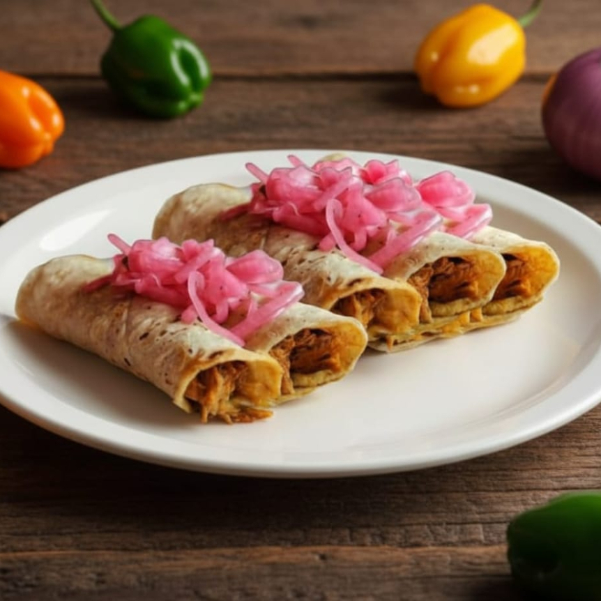 Taco relleno de exquisita cochinita pibil, con tortilla calientita acompañado de cebollita morada curtida y salsa verde habanera