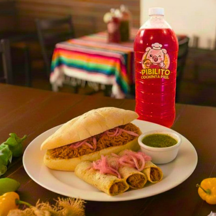 Una Torta rellena de exquisita cochinita pibil con bolillo doradito con un toque de mayonesa y tres tacos bien servidos con una agua de jamaica de 500ml, con cebollita morada curtida acompañados de salsa verde habanera