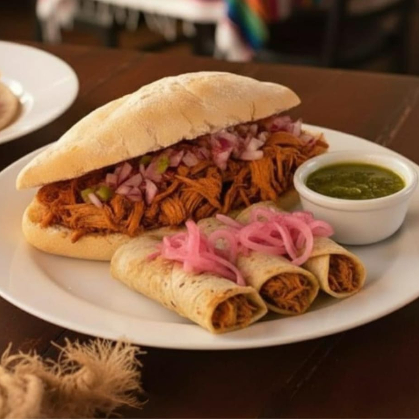 Una torta rellena de exquisita cochinita pibil con bolillo doradito con un toque de mayonesa y tres tacos bien servidos con cebollita morada curtida acompañados de salsa verde habanera deliciosa