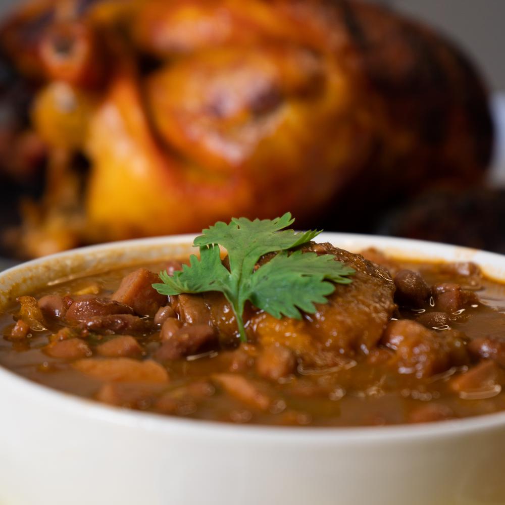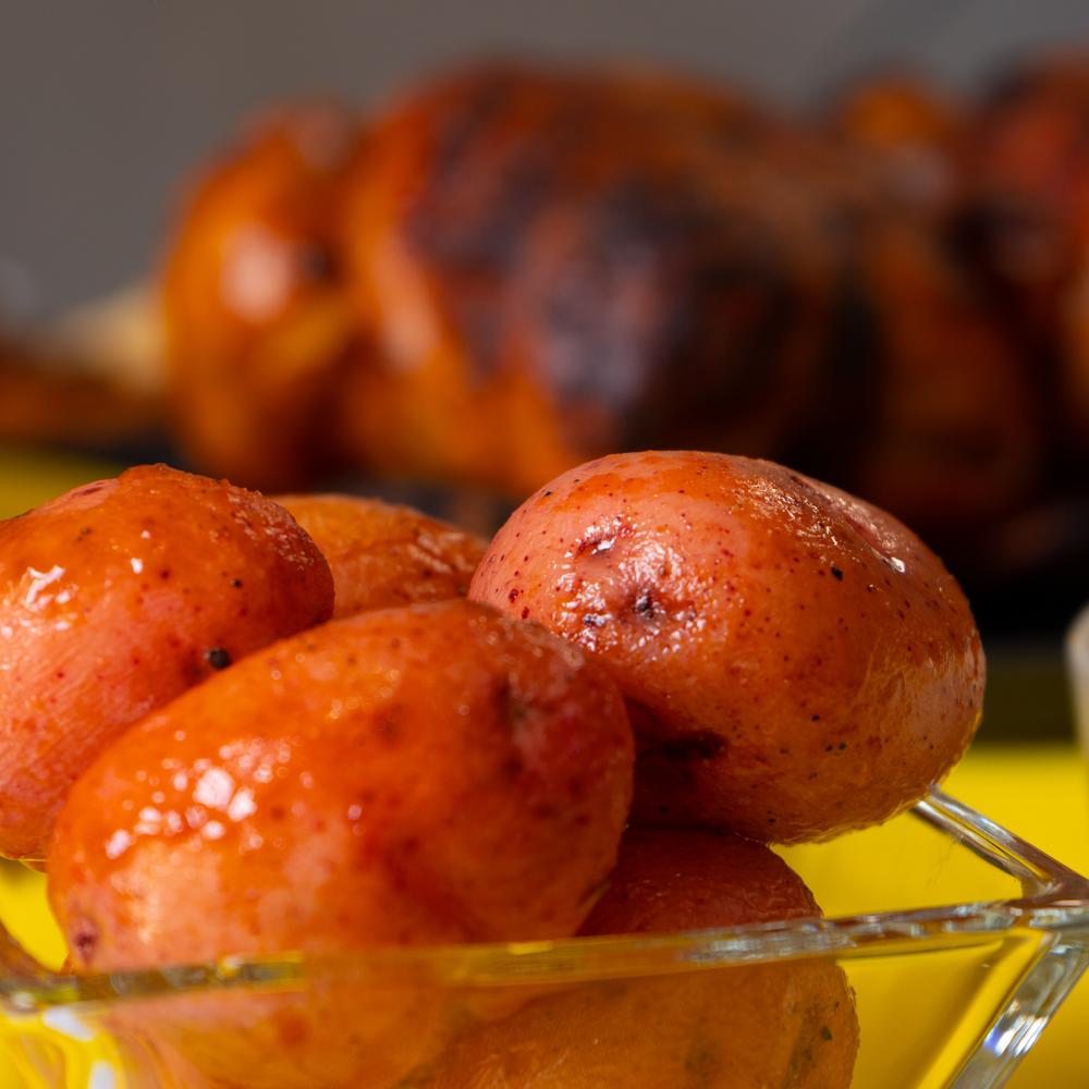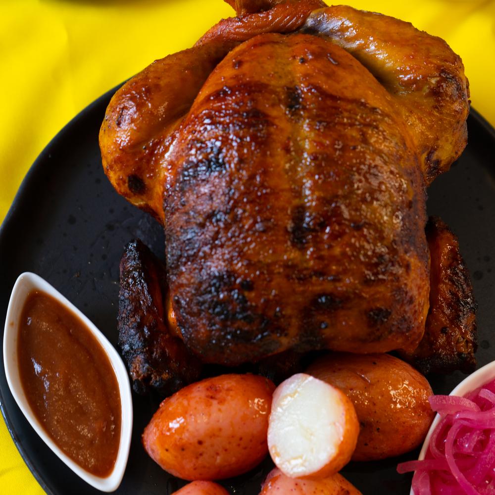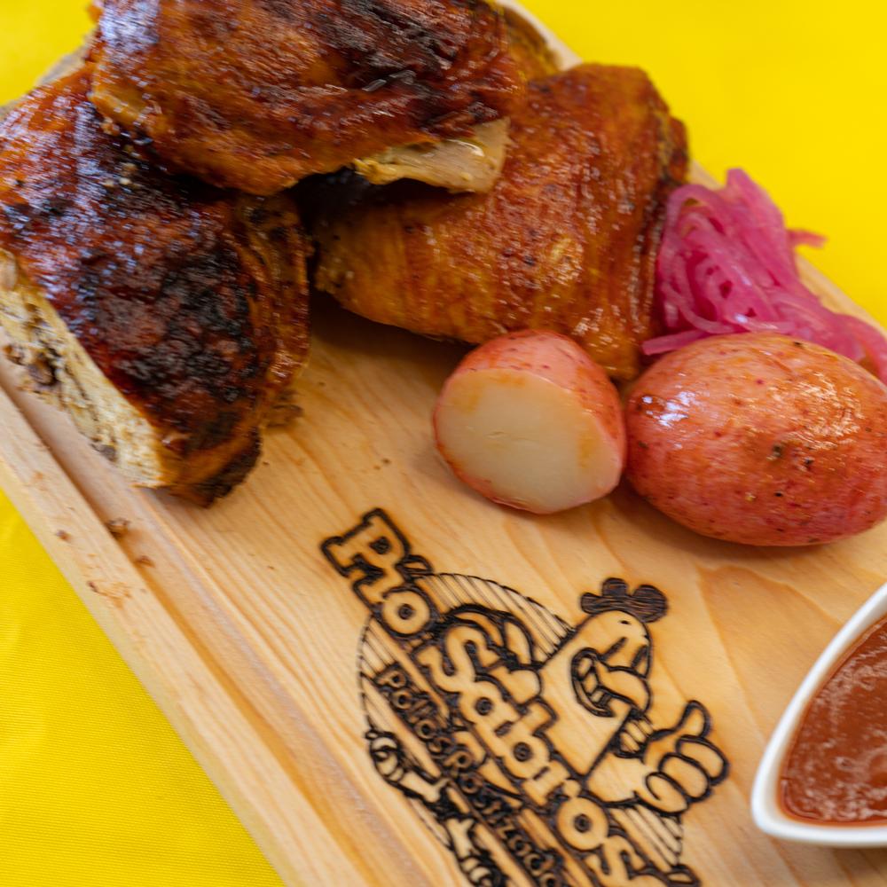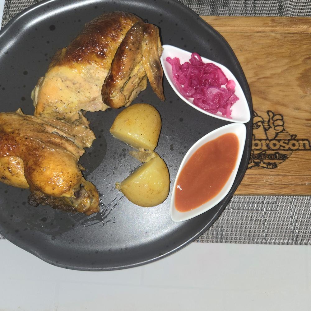 Delicioso y jugoso pollo rostizado. Acompañado de papas cambray, salsa habanera, cebolla morada curtida y tortillas de maiz
