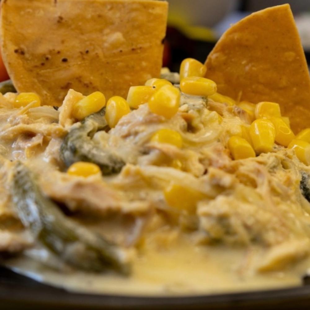 Deliciosas y cremosas rajas poblanas con pollo. Aprox 250gr