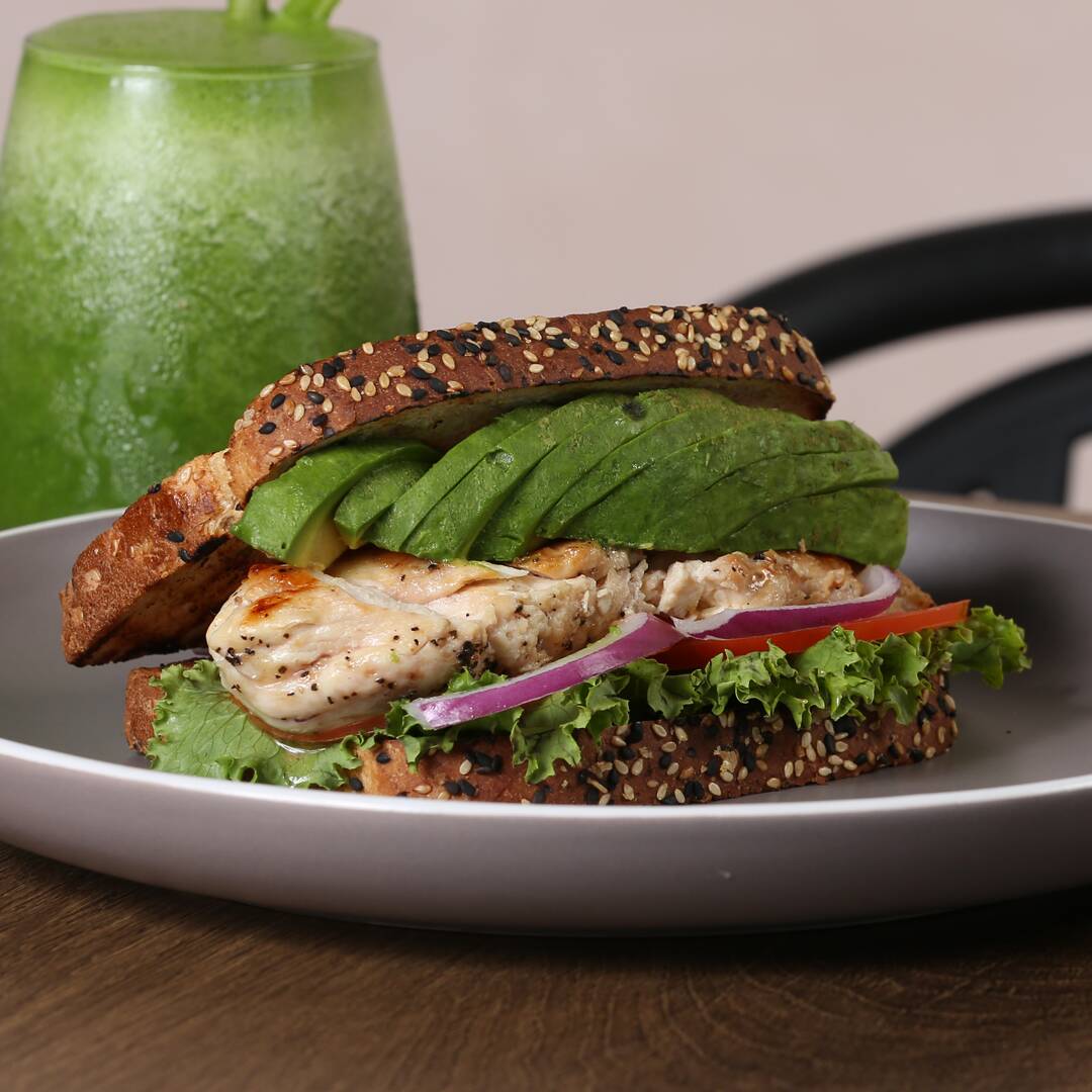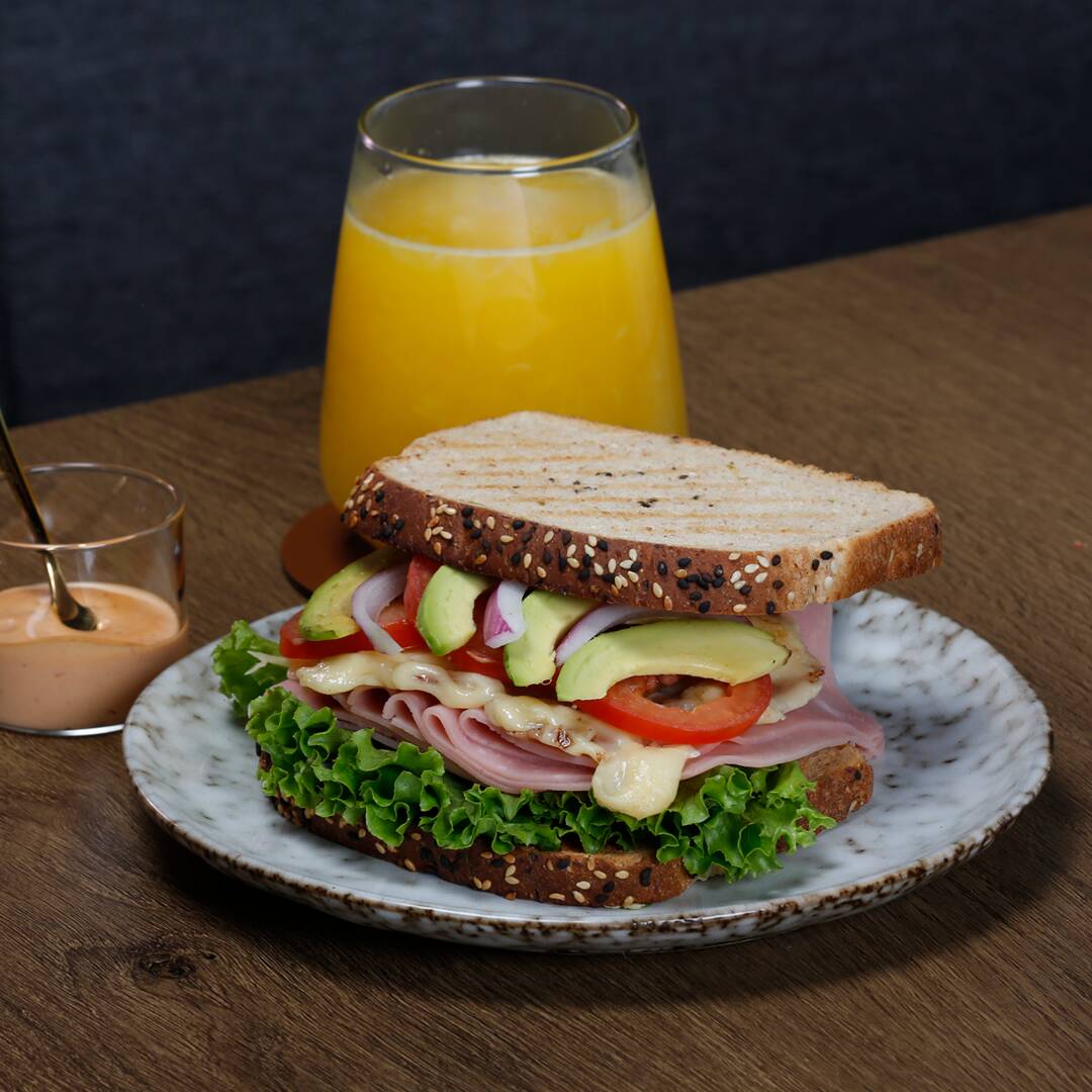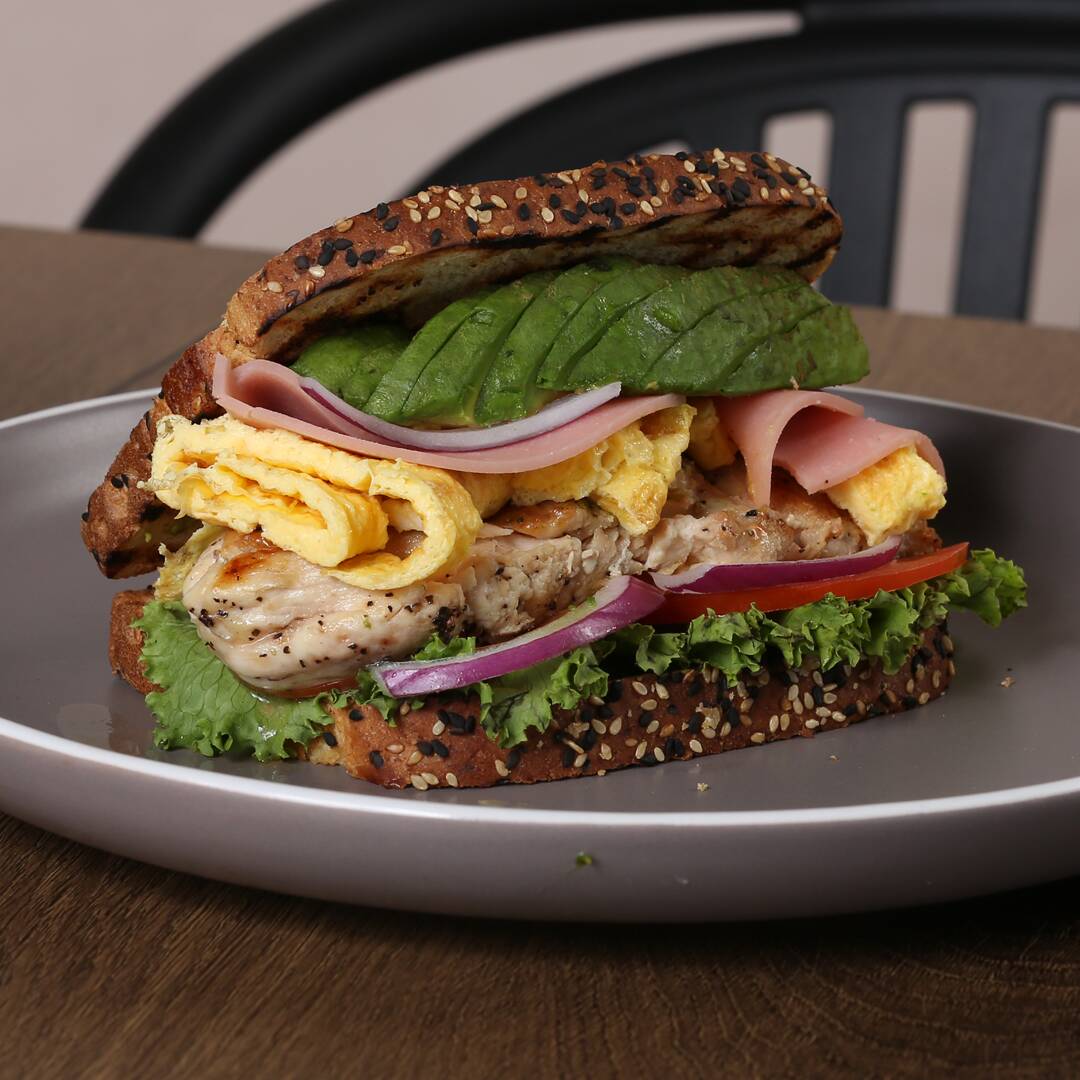 Sándwich. Huevo, Pollo, Jamón De Pavo, Lechuga, Aguacate, Cebolla Morada, Aderezo De Cilantro, Chipotle Cremoso O De Tamarindo