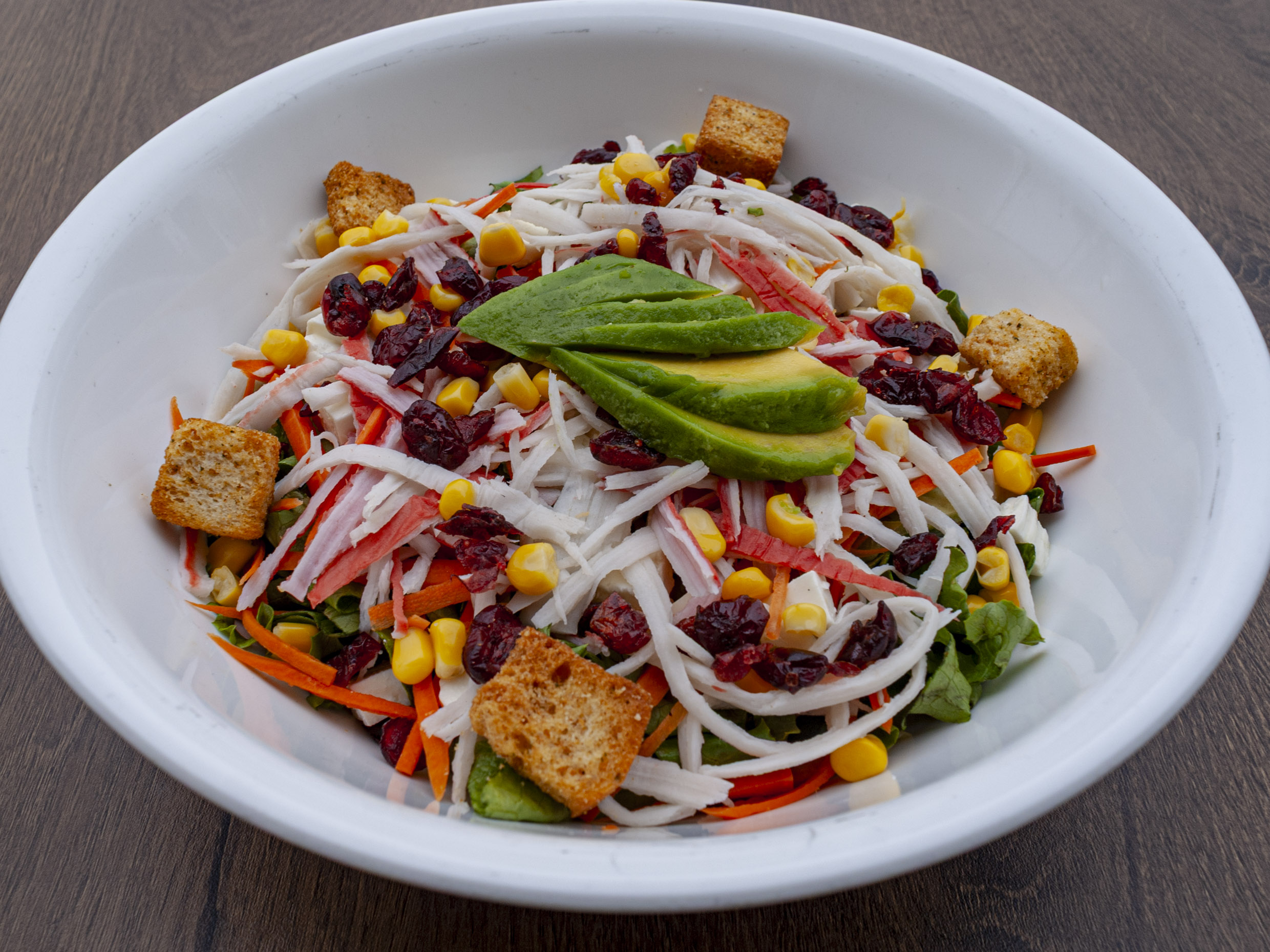Rica Mezcla Zanahoria Rayada, Pepino, Aguacate, Queso Panela, Elote, Arándano Y Surimi Acompañada De Aderezo Cremoso