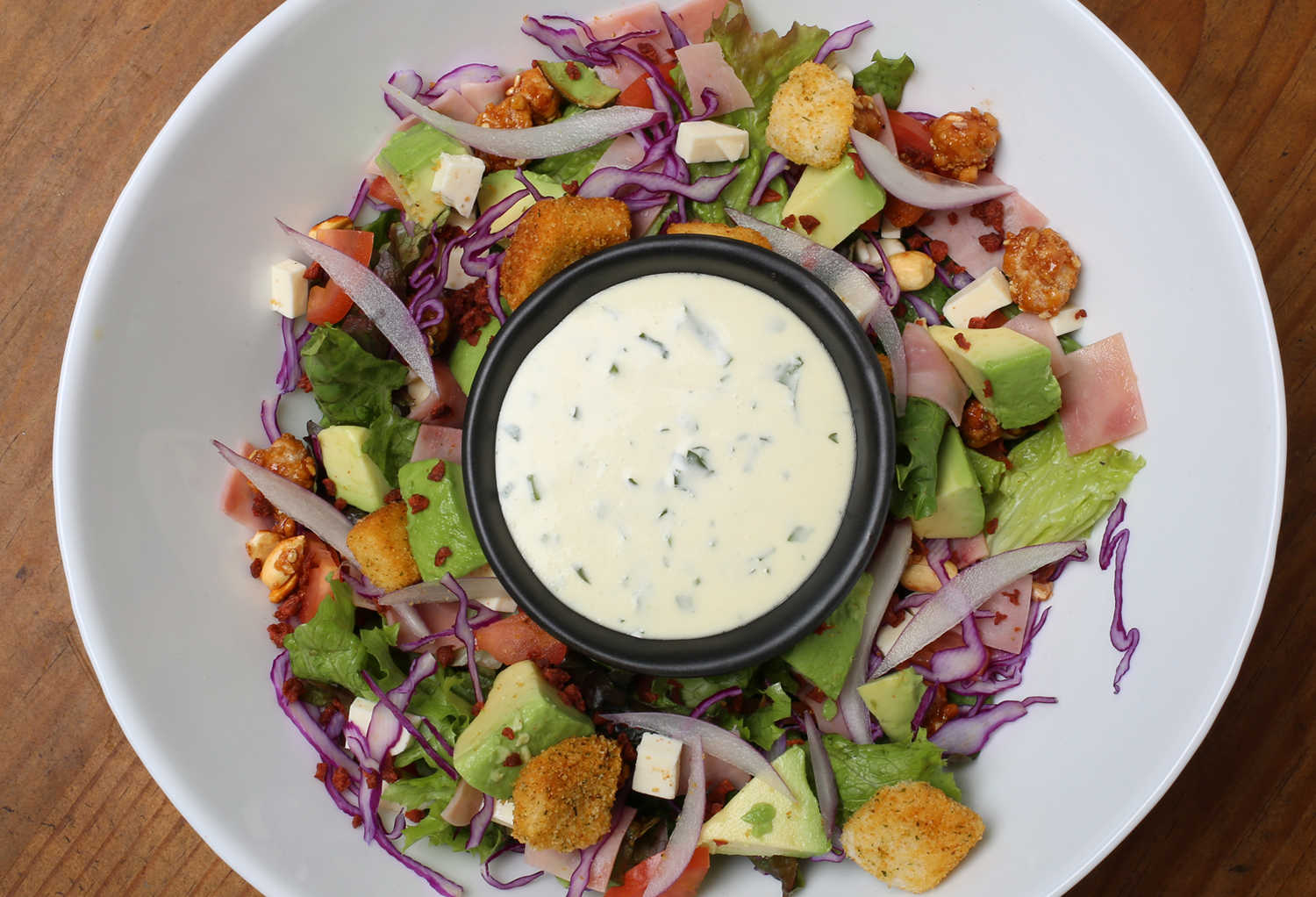 Jamón De Pavo, Queso Panela, Tocino, Aguacate, Tomate, Cebolla Morada, Garapiñado, Col Morada Con Aderezo De Ajo Parmesano O Blue Chesse