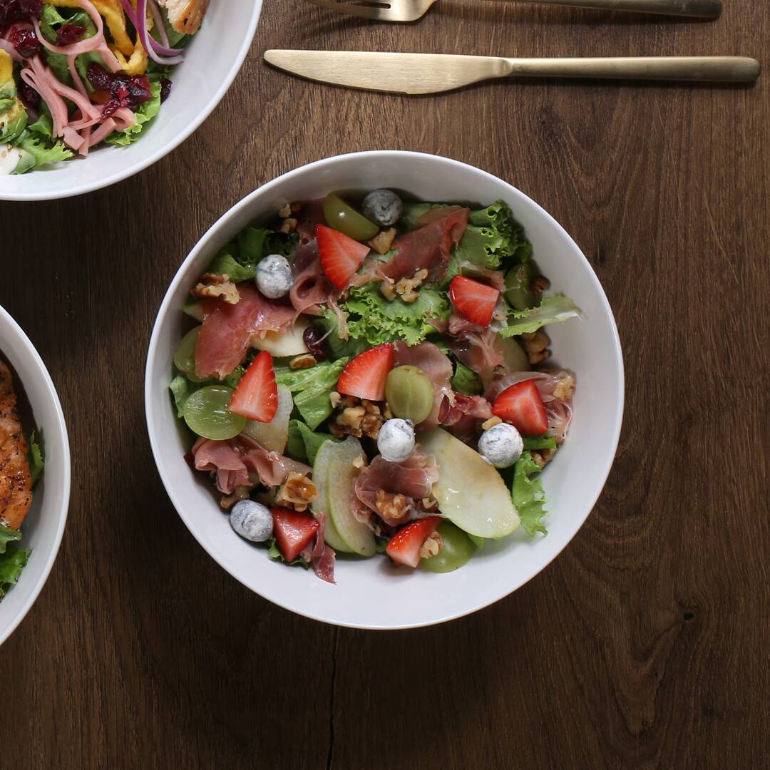 Jamón Serrano, Nuéz, Pera, Fresa, Queso De Cabra, Uva Acompañada De Vinagreta De Arándano