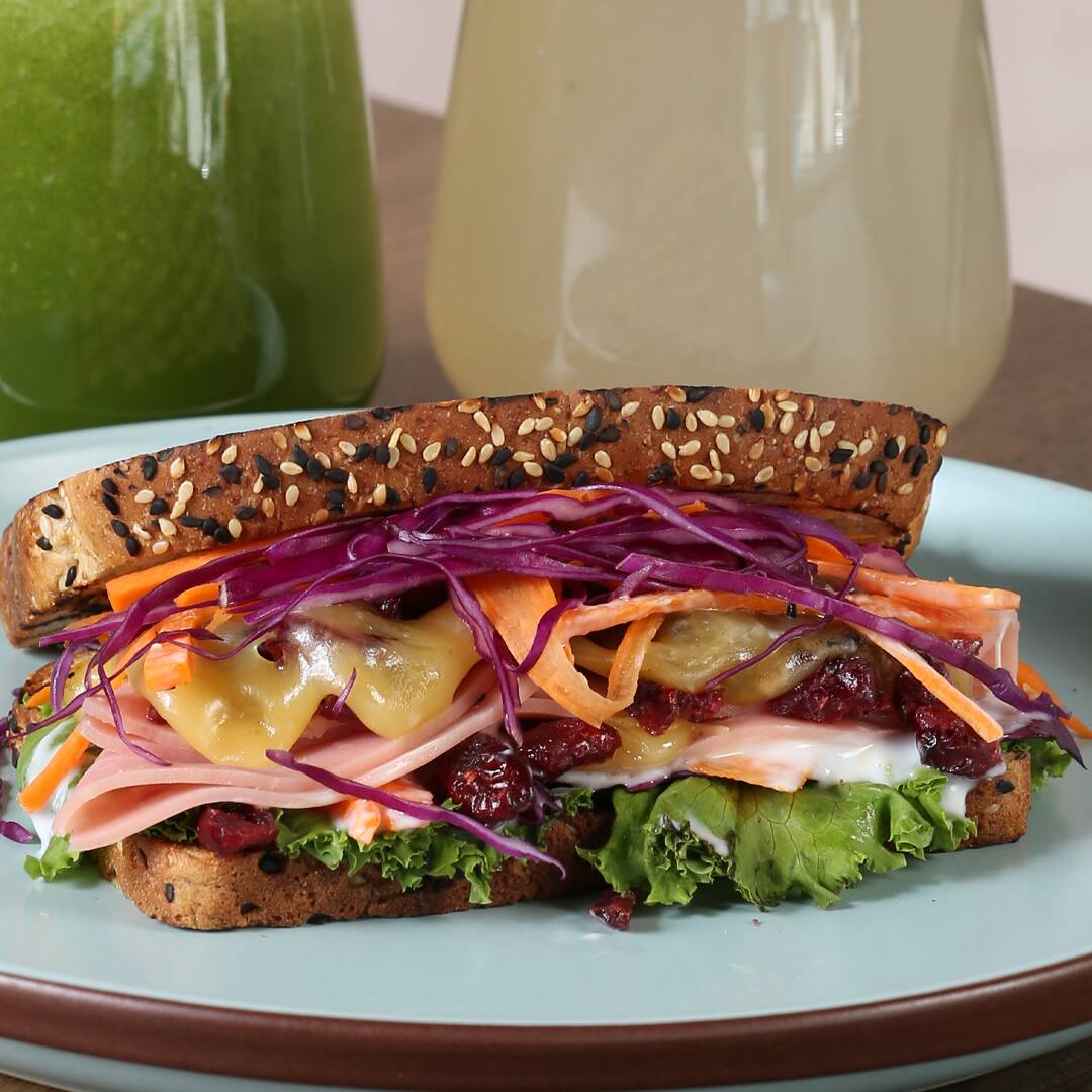 Jamón de pechuga de pavo con queso manchego y un mix de lechuga, zanahoria, col morada, aguacate, acompañado de cebolla con yogurt griego y tropiezos de arándano