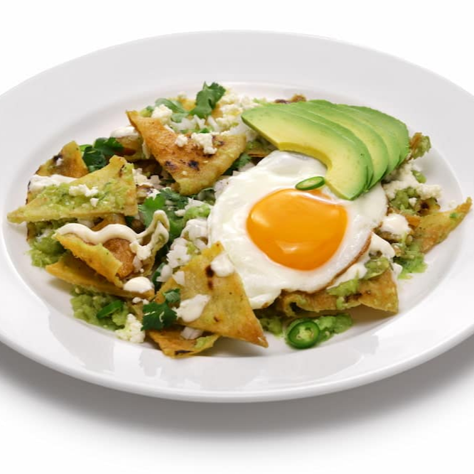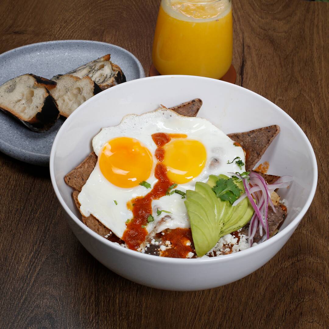 Bañados en salsa roja, con aguacate, crema, queso y cebolla morada.