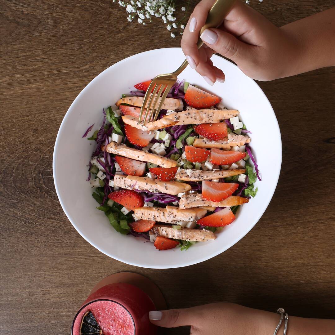 Salmón, Queso Panela, Col Morada, Apio, Fresa Con Semilla De Chia Y Aderezo De Maracuyá