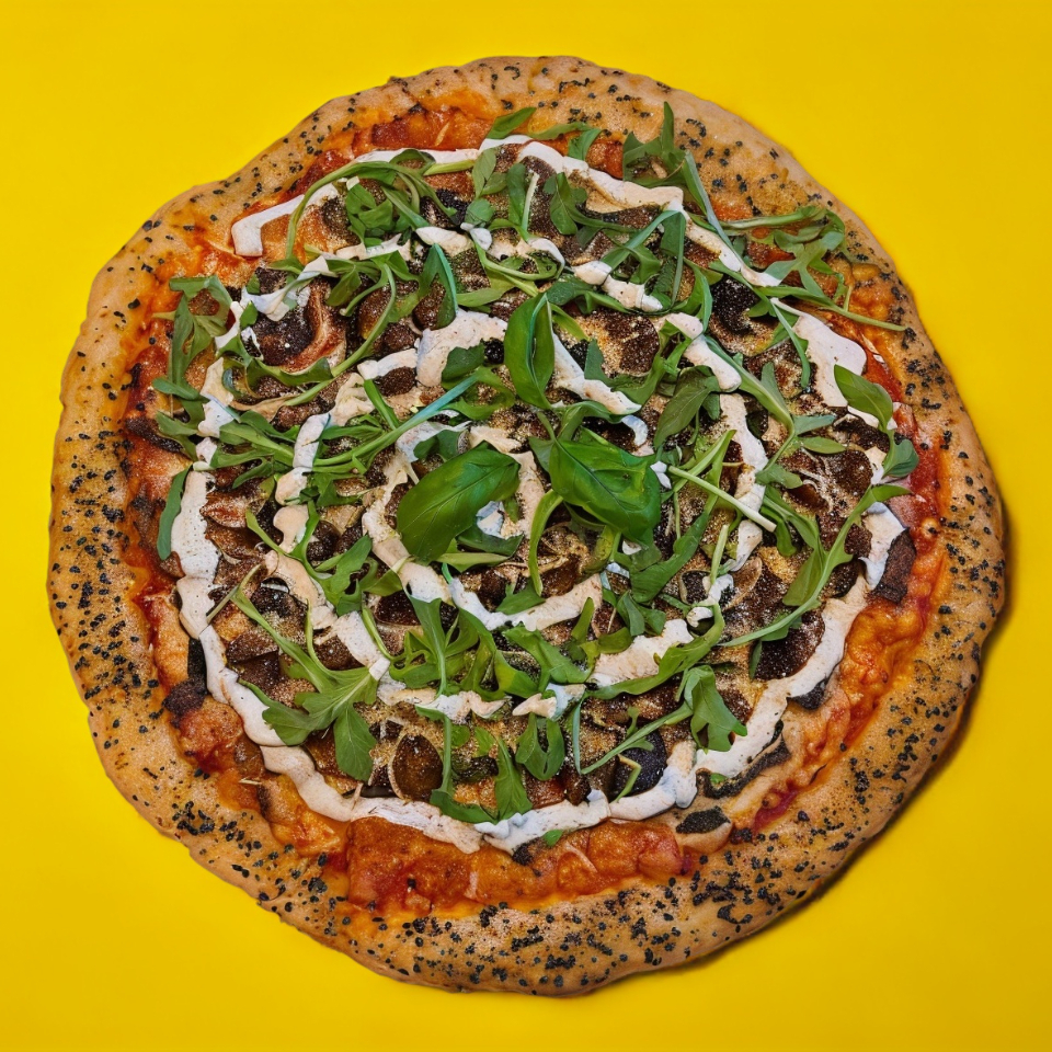 Salsa de tomate, queso mozzarella, champiñones, queso parmesano, arúgula y aderezo ajo/parmesano. Todo hecho con masa madre y artesanalmente.