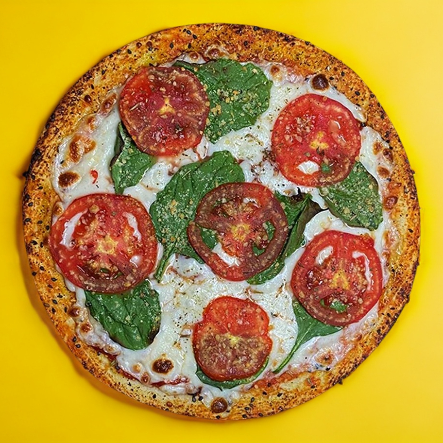 Salsa de tomate, queso mozzarella, espinaca, rebanadas de tomate y parmesano. Todo hecho con masa madre y artesanalmente.