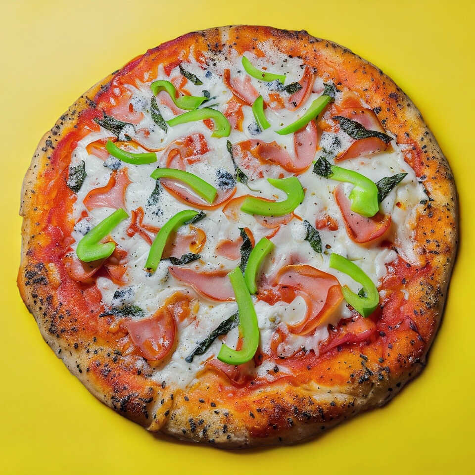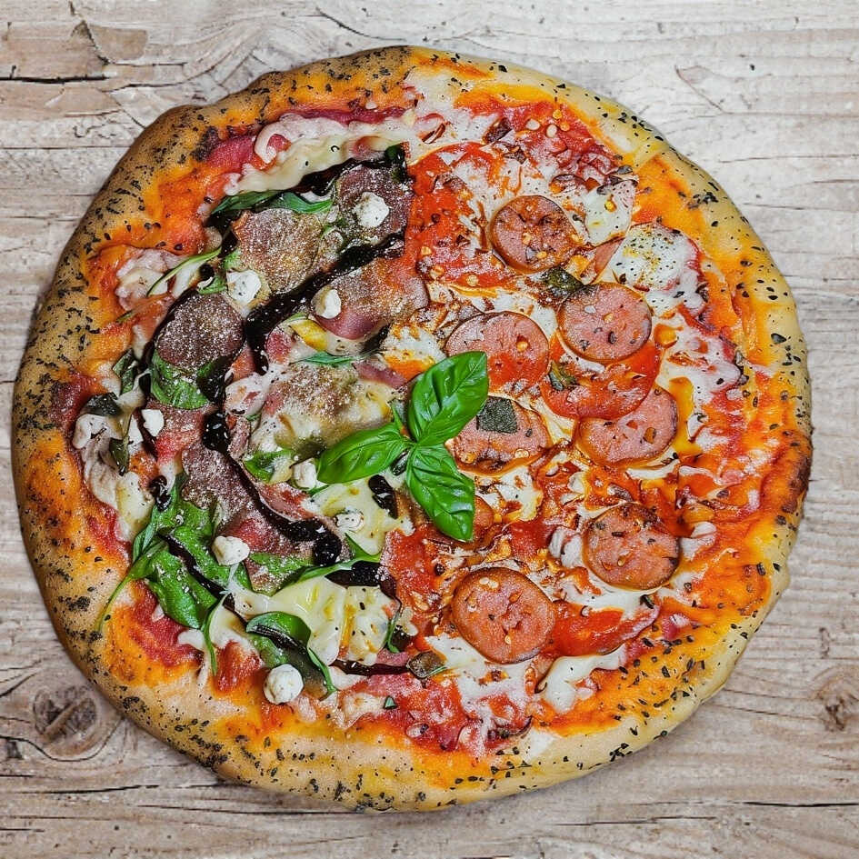 Salsa de tomate, queso mozzarella, lomo embuchado, pimiento verde y queso de cabra. Todo hecho con masa madre y artesanalmente.
