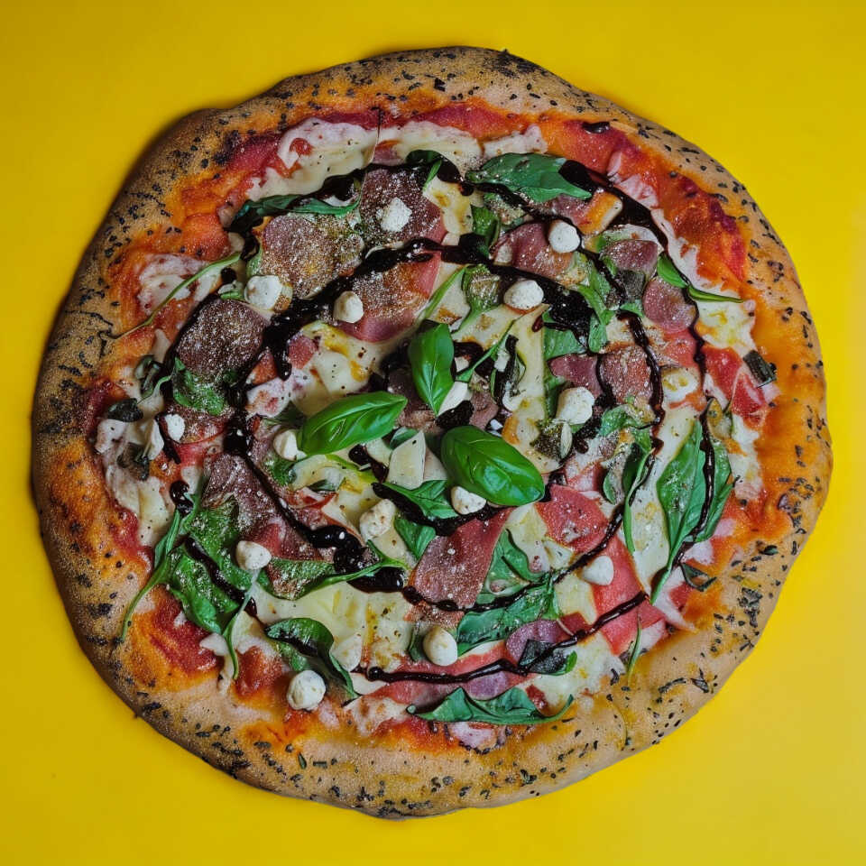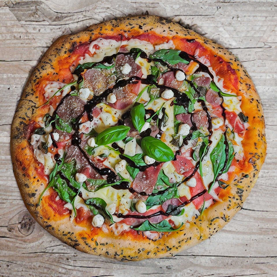 Salsa de tomate, queso mozzarella, jamón serrano, queso de cabra, espinaca, parmesano y glaseado balsámico. Todo hecho con masa madre y artesanalmente.