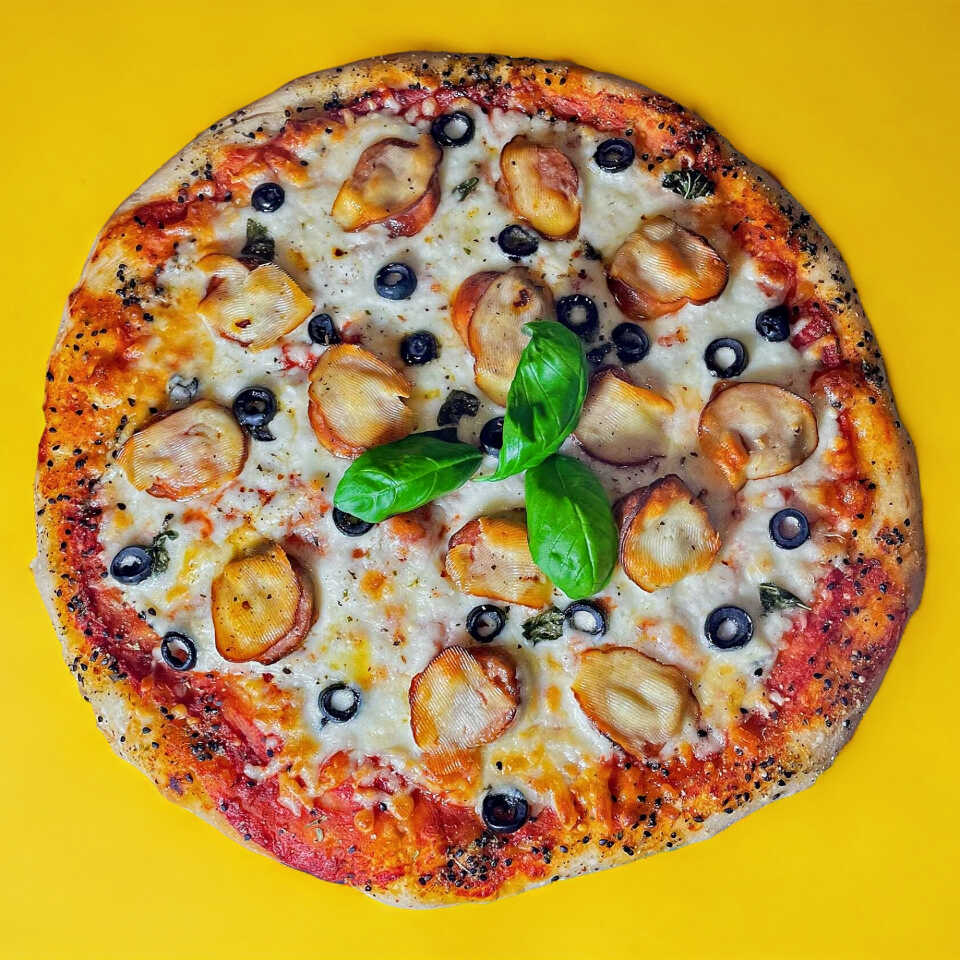 Salsa de tomate, queso mozzarella, chorizo argentino, provolone de búfala y aceitunas negras. Todo hecho con masa madre y artesanalmente.